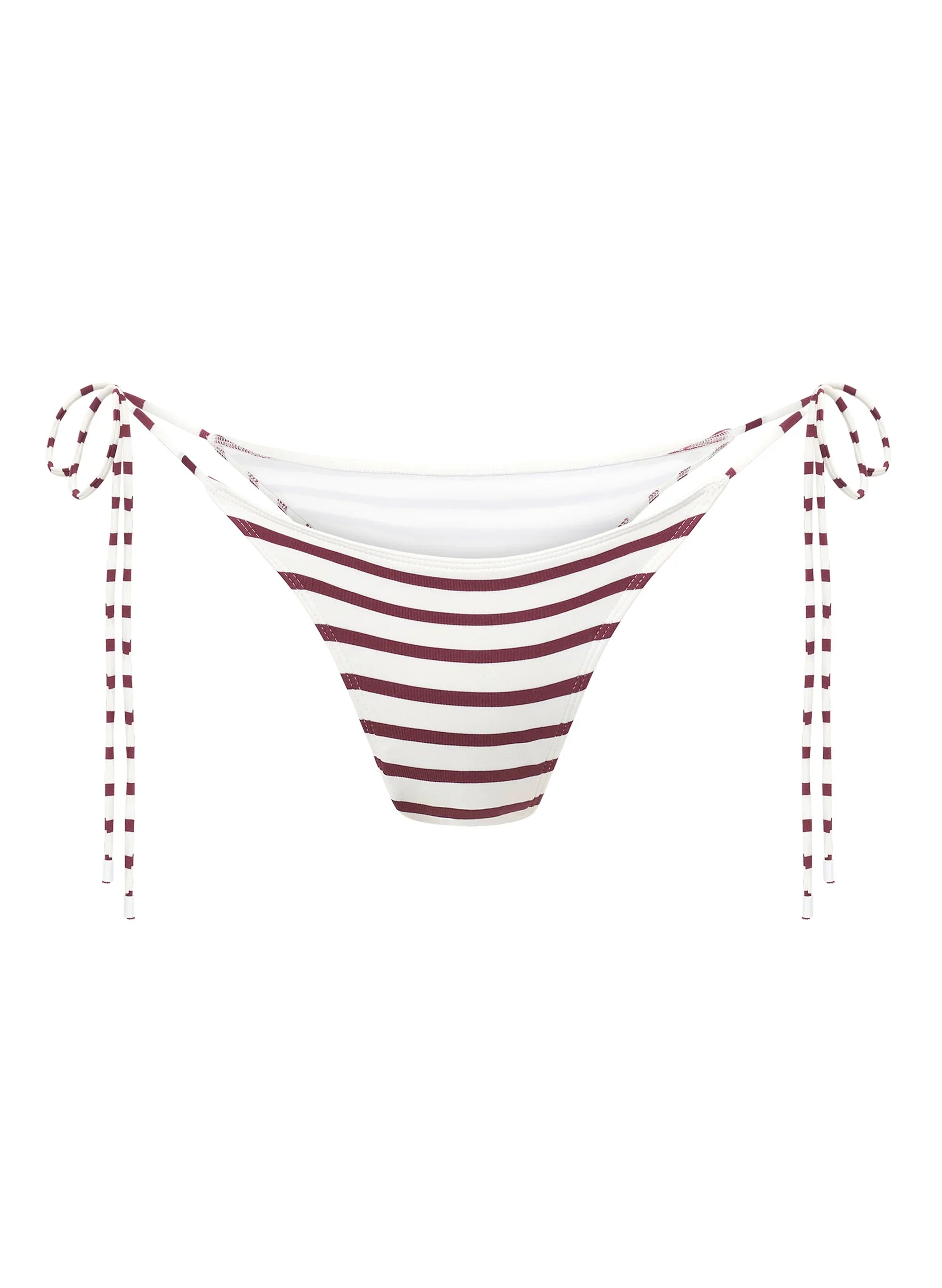 The Amina Bikini Bottom in syrah and off-white stripes is crafted from our structured and fade-resistant swim fabric sourced from Italy and made in the USA. with incredible stretch and recovery. This minimal silhouette offers medium coverage with a low rise and string ties for a classic two-piece look. This style runs true to size. Shop Swim.