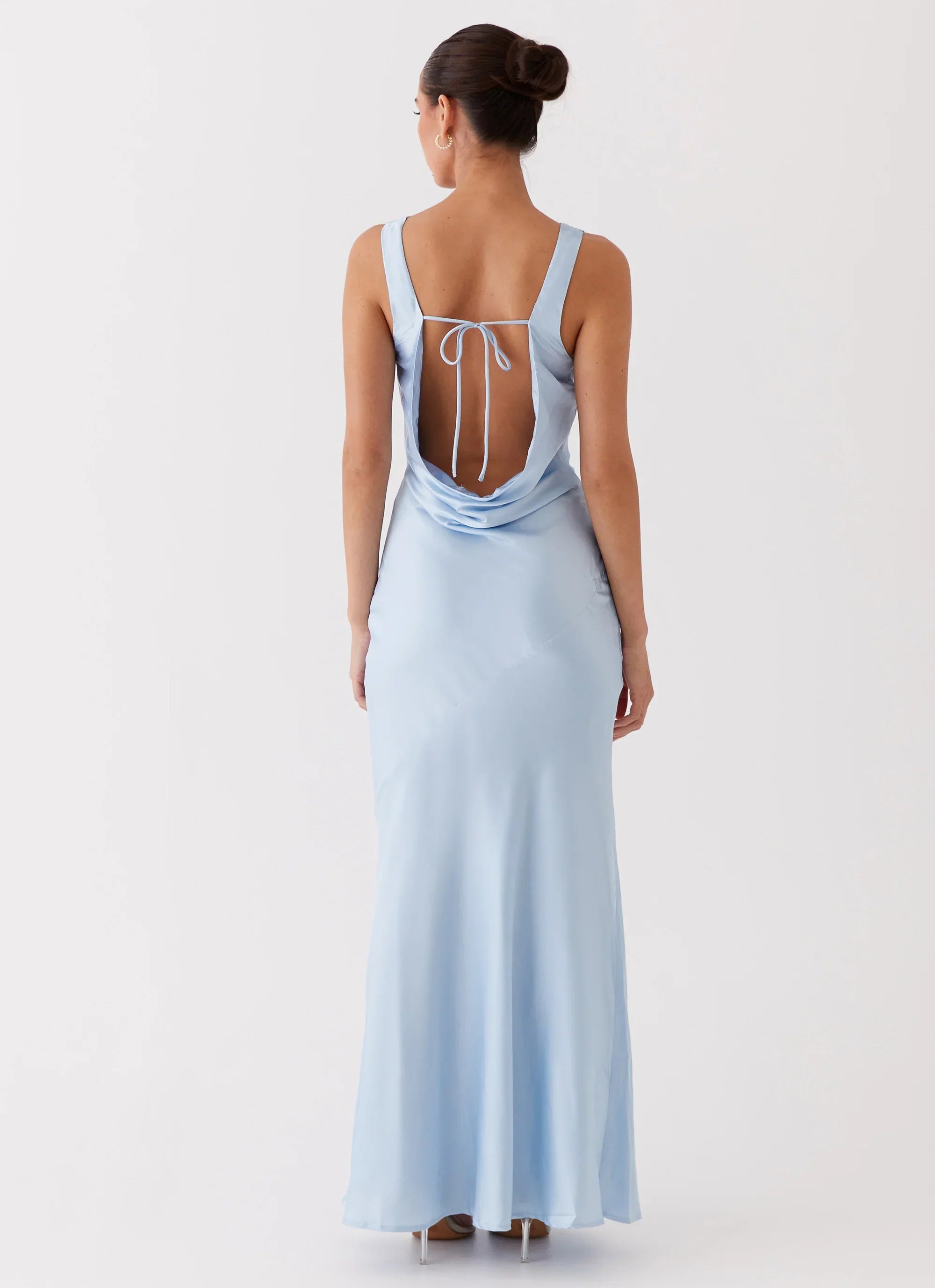 Introducing the Be Mine Satin Maxi Dress in blue. With its draping silhouette and glamorous cowl neckline, it's designed to elevate your elegance from sunset to sundown.