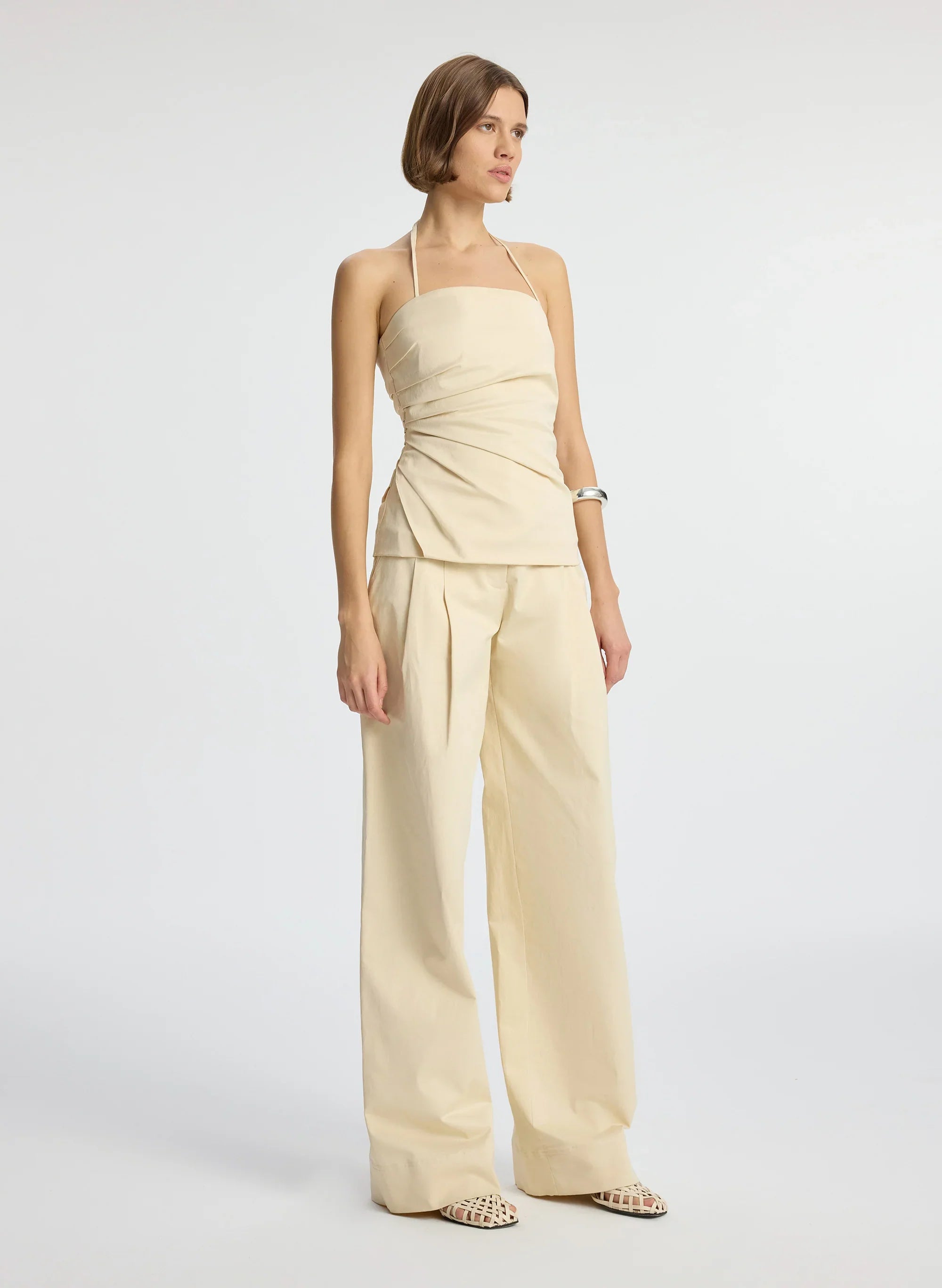 The Bennett Pant is crafted from a sandy beige shade of our lustrous stretch sateen suiting fabric featuring an incredibly flexible yet structured feel. This tailored. wide-leg trouser features a bandless. high-rise waist with contrast stitching and pleated seams that enhance the body's natural curvature. Shop Bottoms