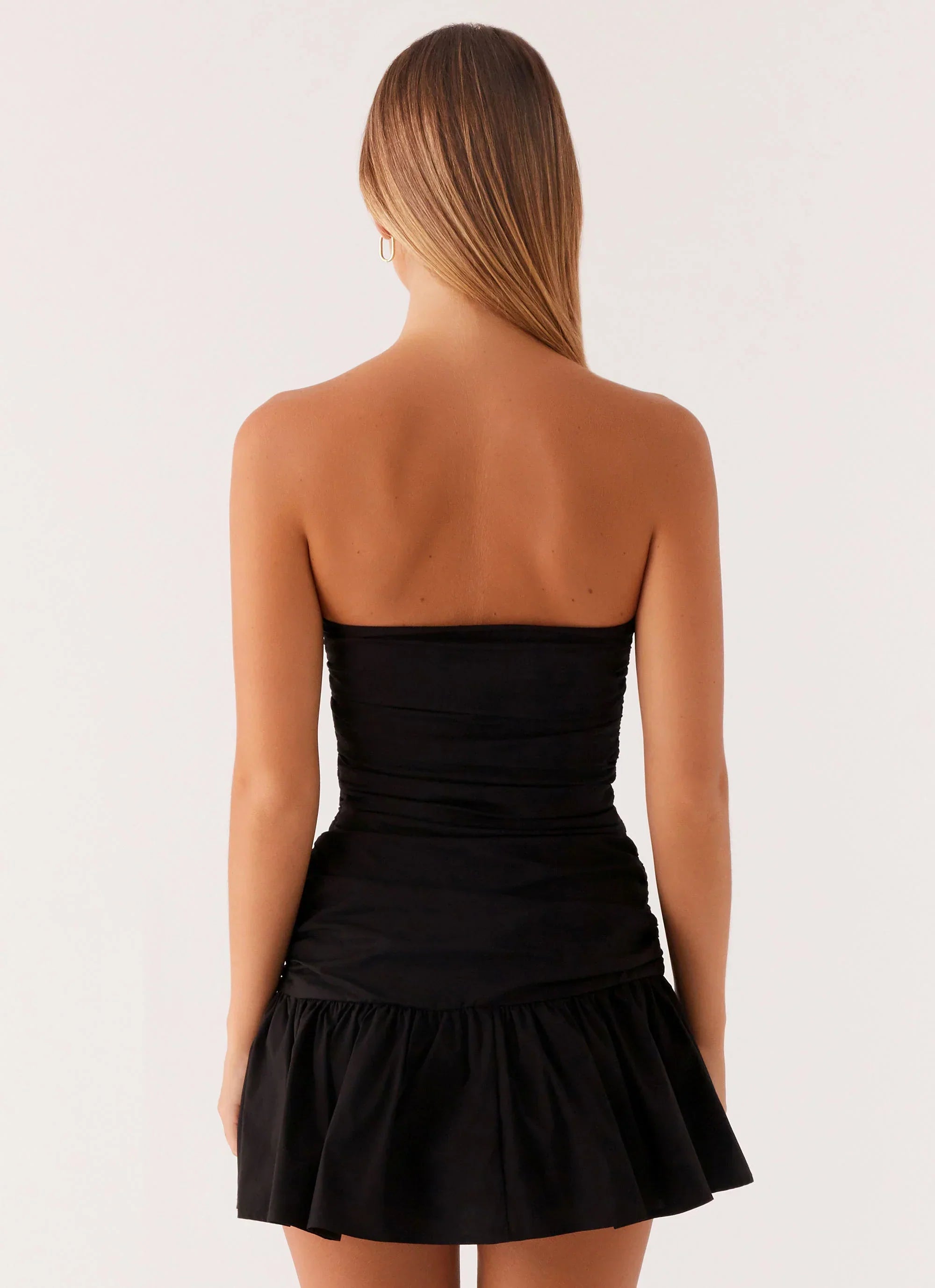 The Carmel Mini Dress features a strapless neckline with ruched sides and a flattering drop waist. This mini dress combines comfort and style, offering a chic, form-hugging fit with a touch of elegance. Fully lined for a smooth finish, it's perfect for any occasion.