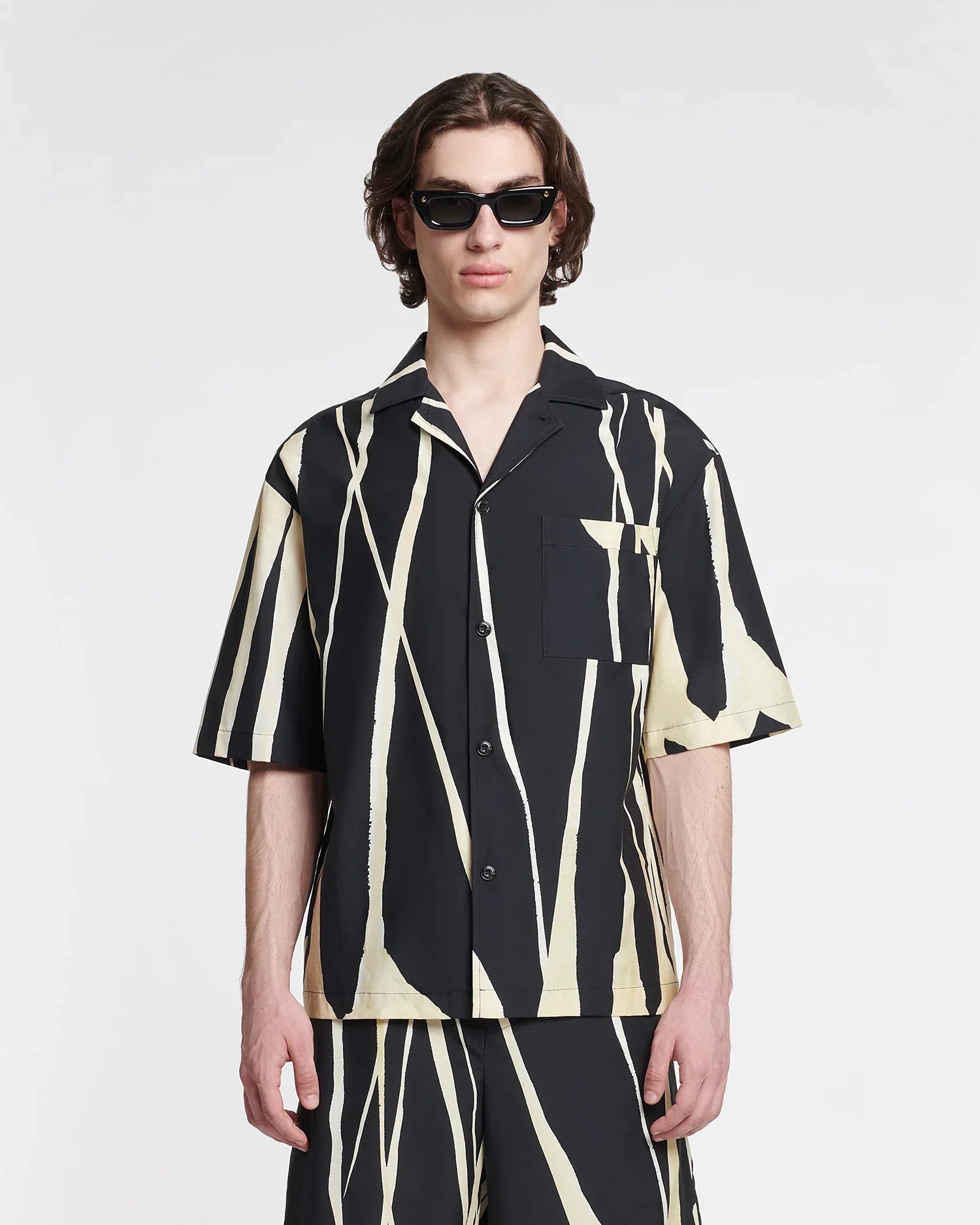 The Caspian shirt is made from a blend of silk and cotton for a luxurious lightweight feel. It is designed for an oversized fit and is decorated with a black and creme Light Fringe print – also seen on the Felix shorts.