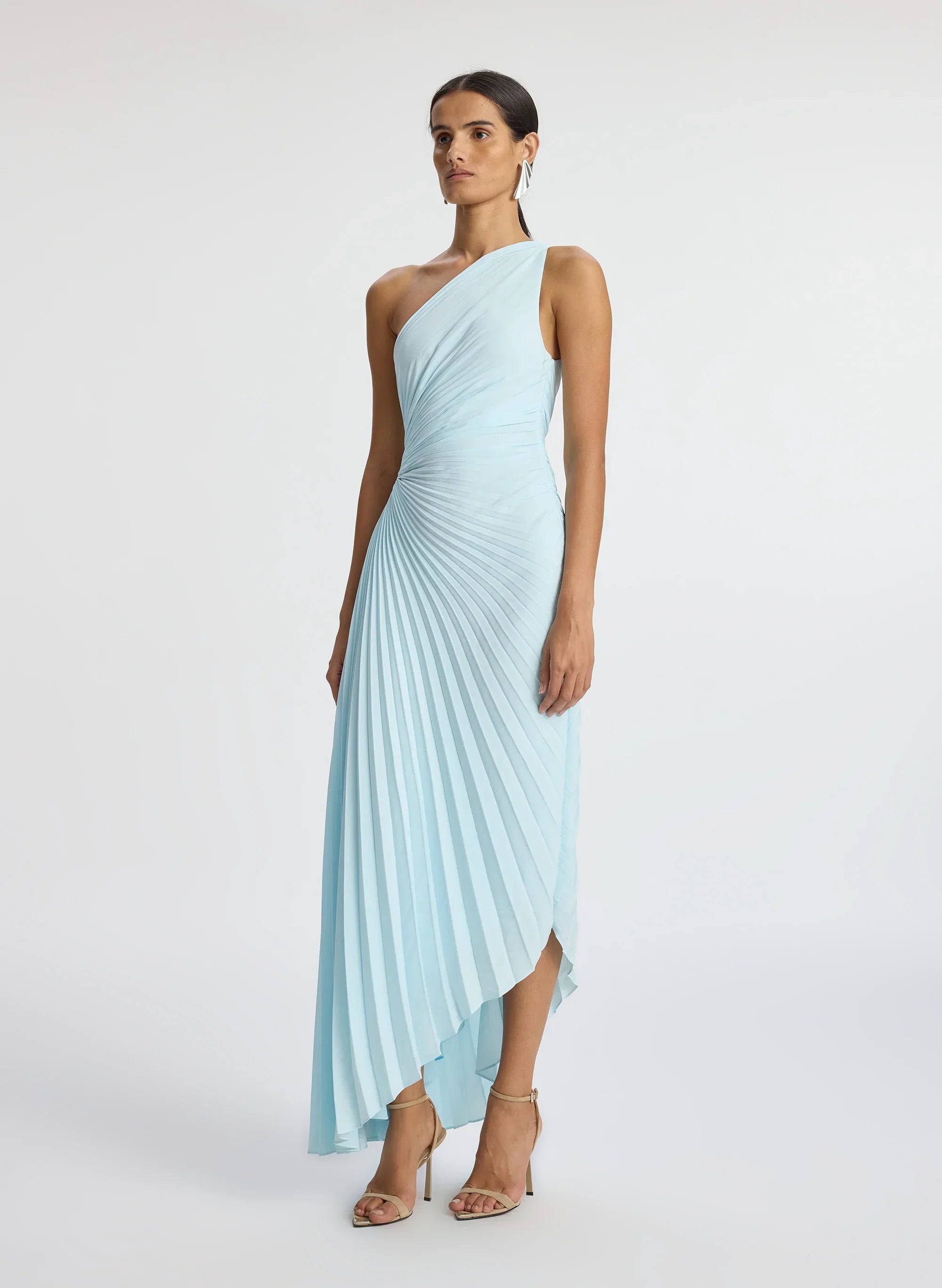 The Delfina Dress. a part of A.L.C.'s Signature Collection. is asymmetrically draped and pleated from our signature matte fabric in an aqua-blue hue. This one-shoulder silhouette features a confident side cutout and high-low hem. This style runs true to size. Shop Dresses