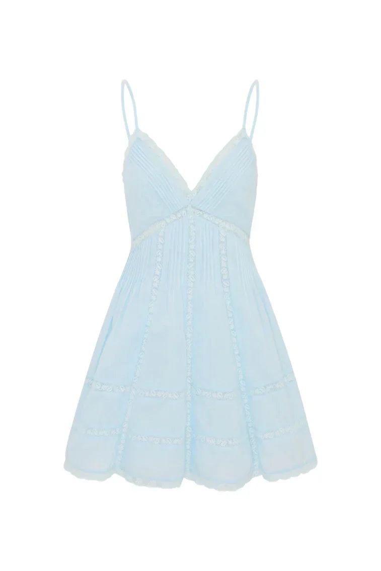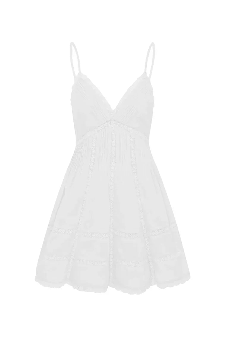 Our Docila Dress is a flirty mini designed with a flattering silhouette with lace insets and pintucking details. The dress features a smocked back, spaghetti straps, and an airy skirt finished with lace.