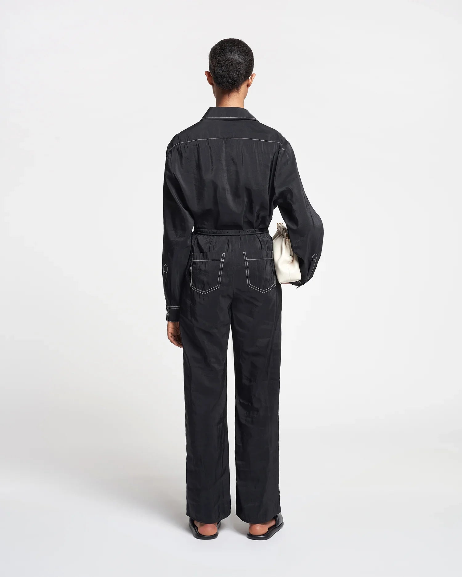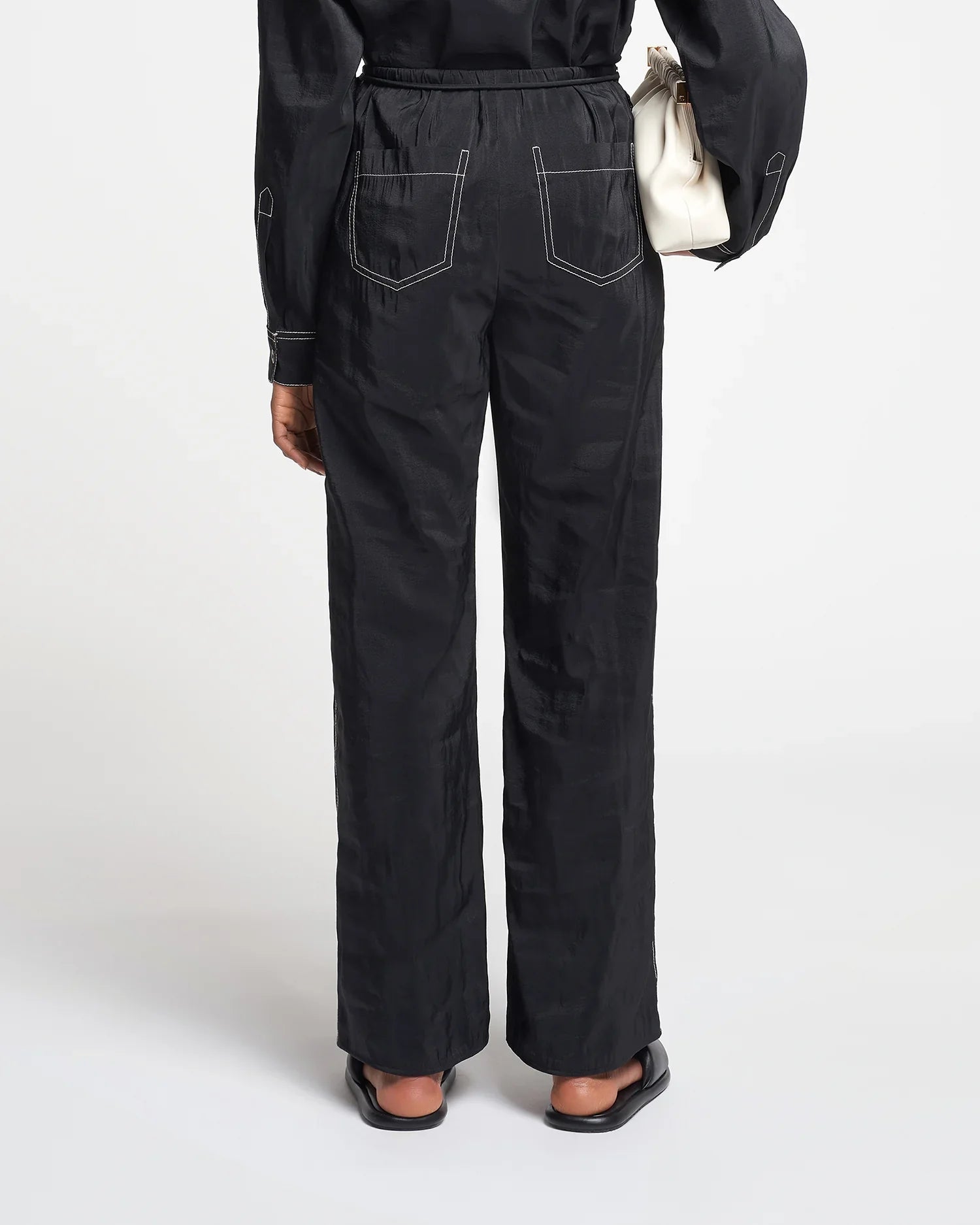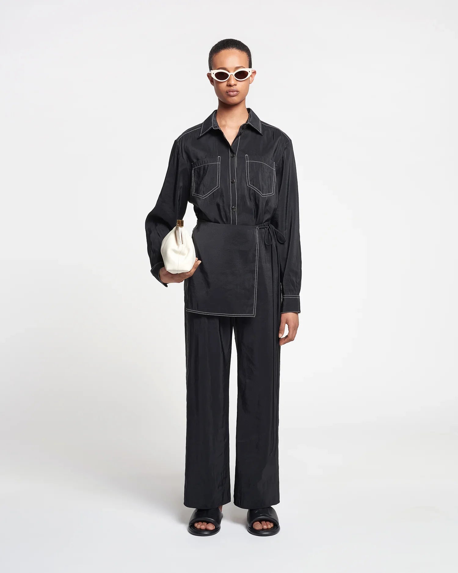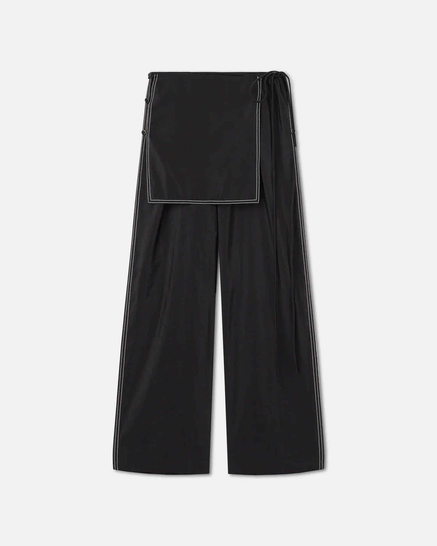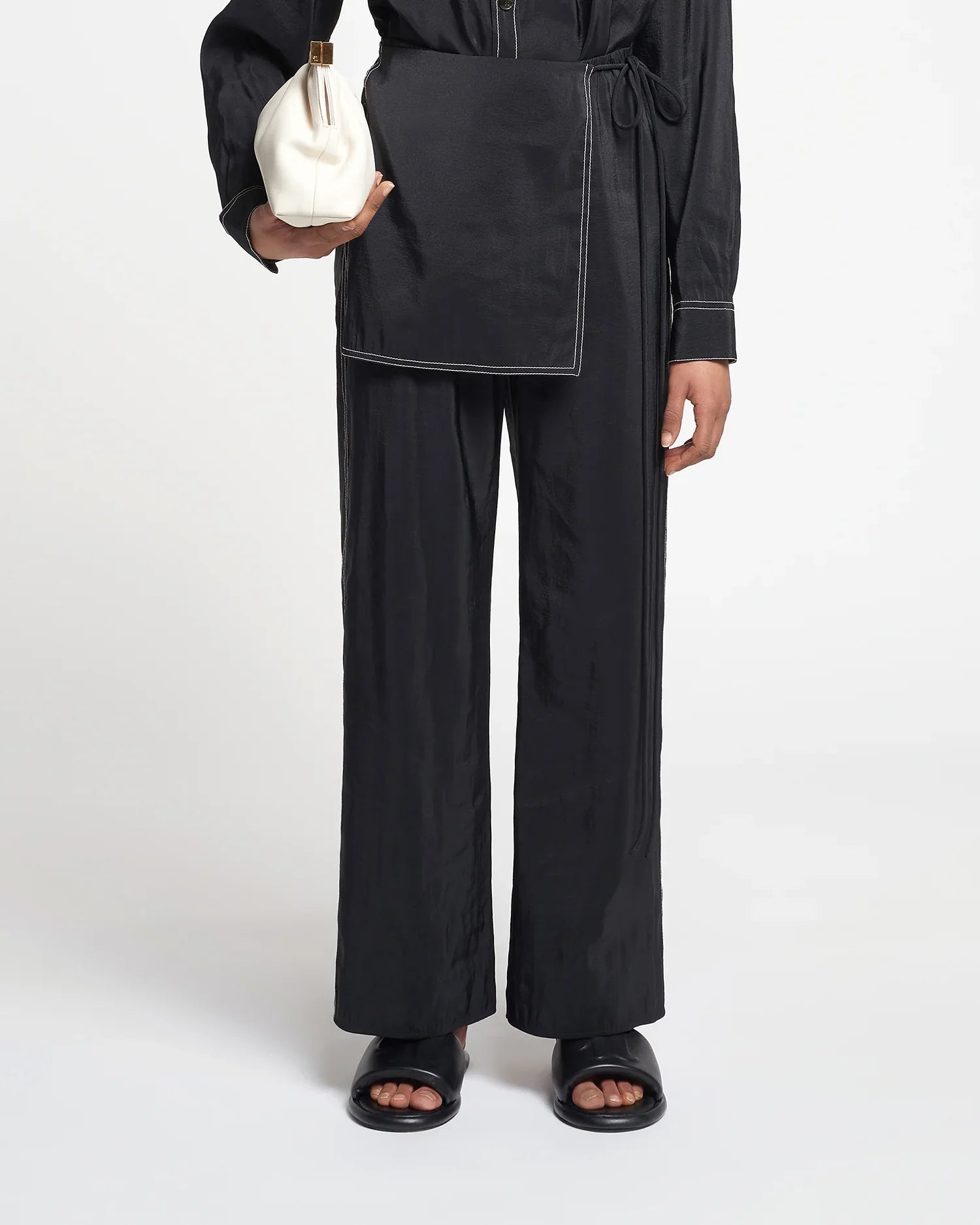 The Evea pants show how decorative modularity is key part of our circular design ethos. They feature a wrap detail at the waist that can be detached for styling versatility. Crafted from glass poplin. they have both structure and sheen.