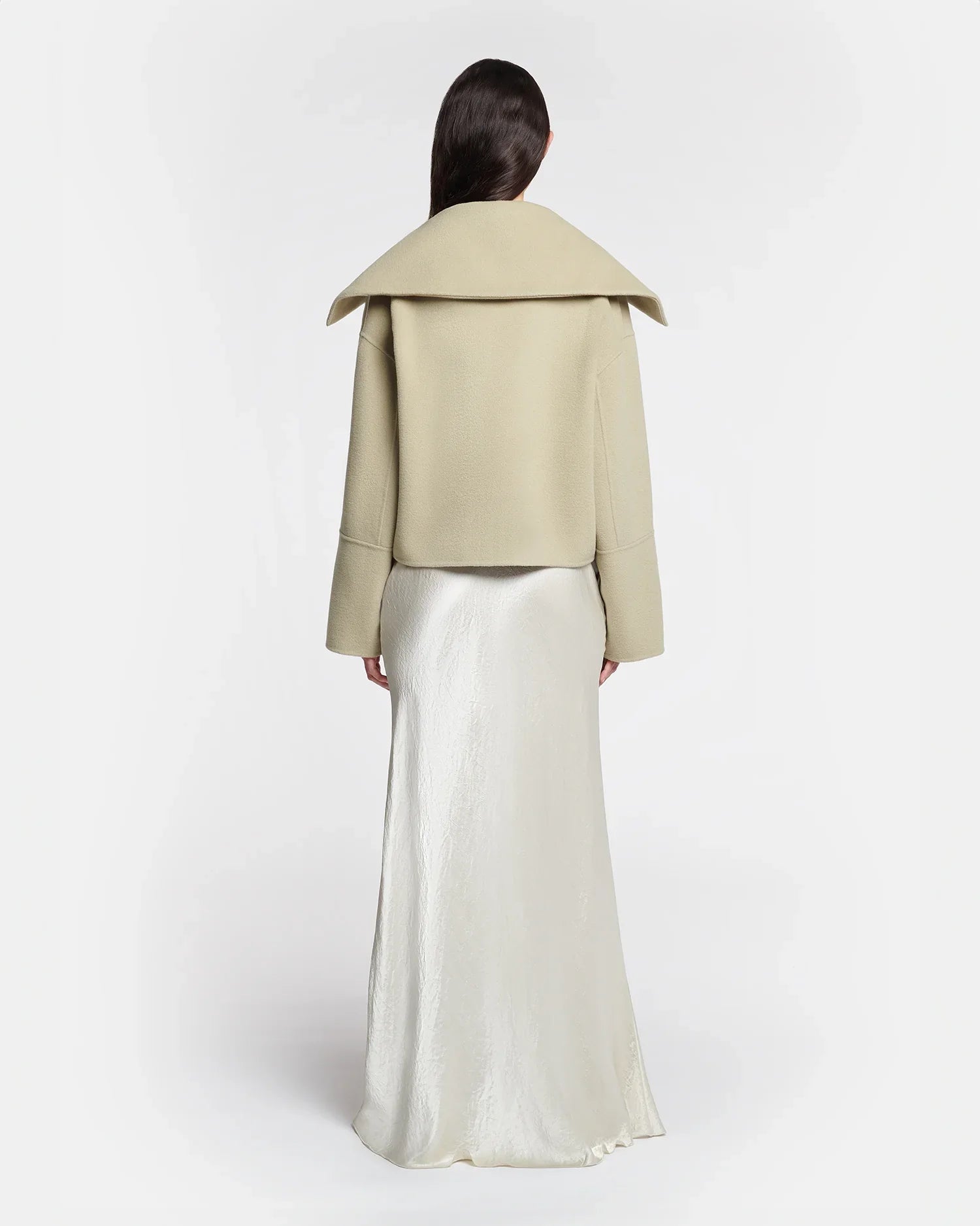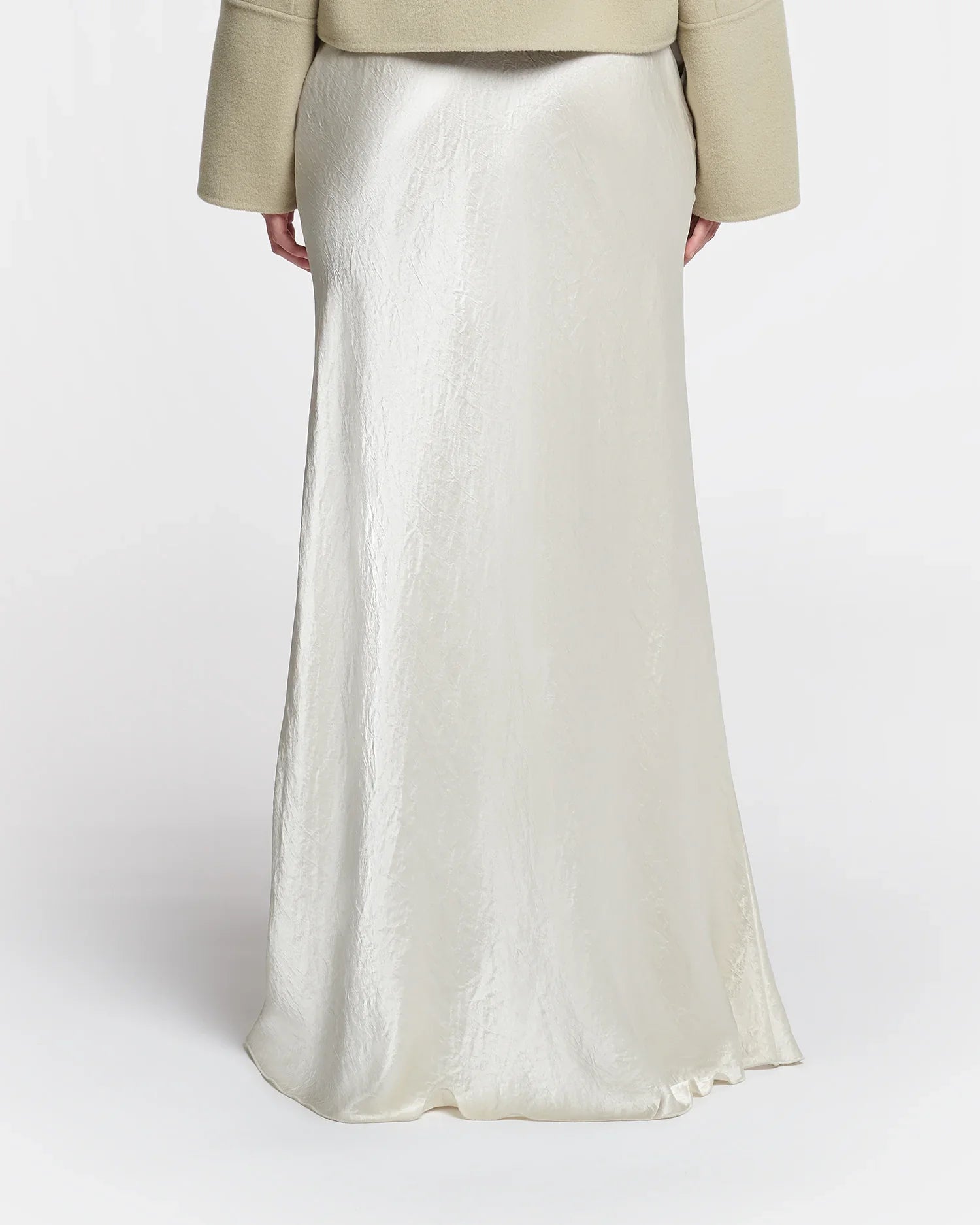 The Fea skirt is cut from crinkled satin that pools beautifully over the feet in a fluted hem. Effortlessly elegant. it sits high on the waist and comes in a neutral ecru tone.