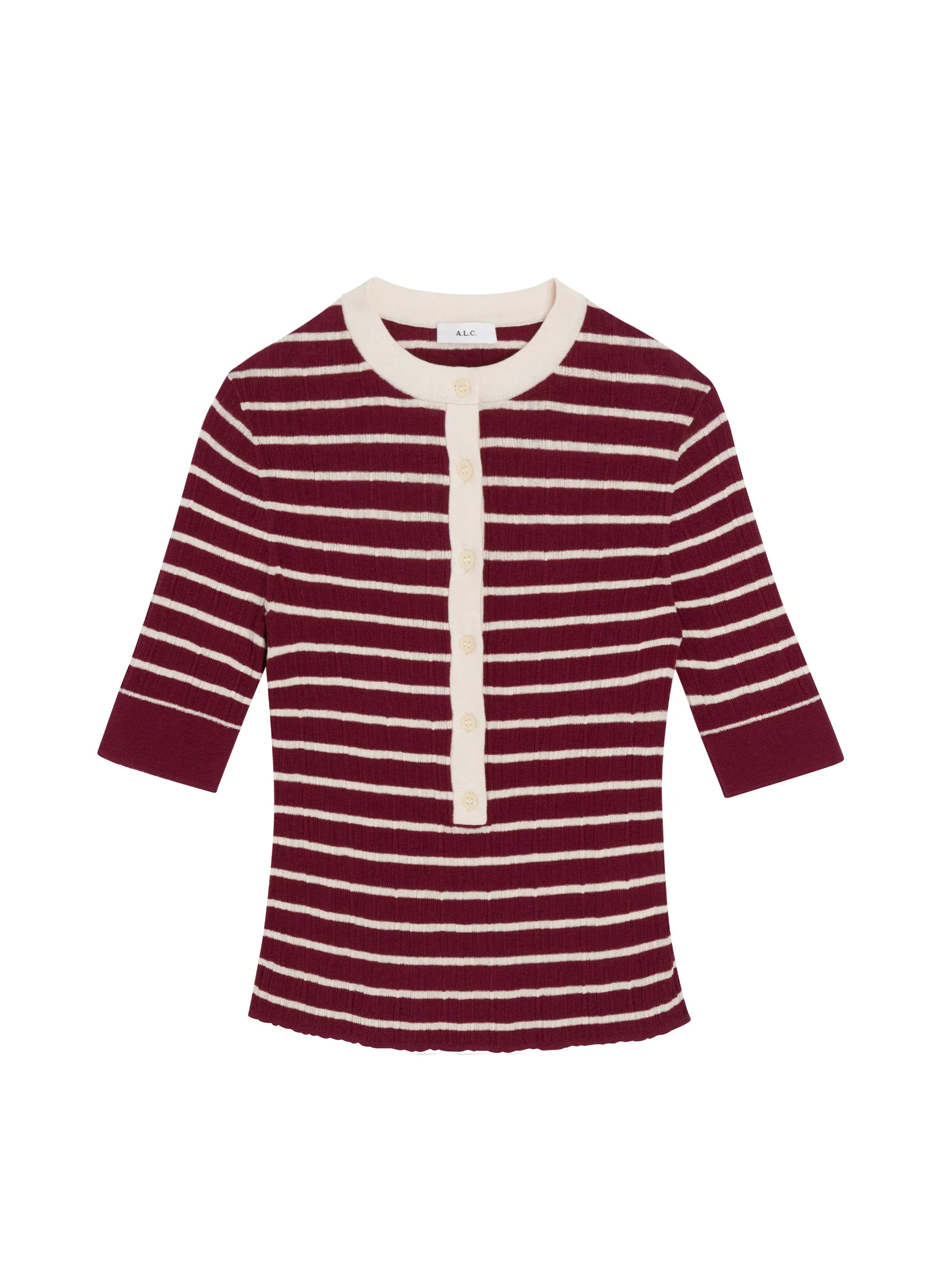 The Fisher Top is knitted from fine gauge cotton-blend yarn in a bright white and syrah stripe. This round-neck silhouette features a button-down placket and 3/4 sleeves. lending a sporty and textural touch to any look. This style runs true to size. Shop Tops.