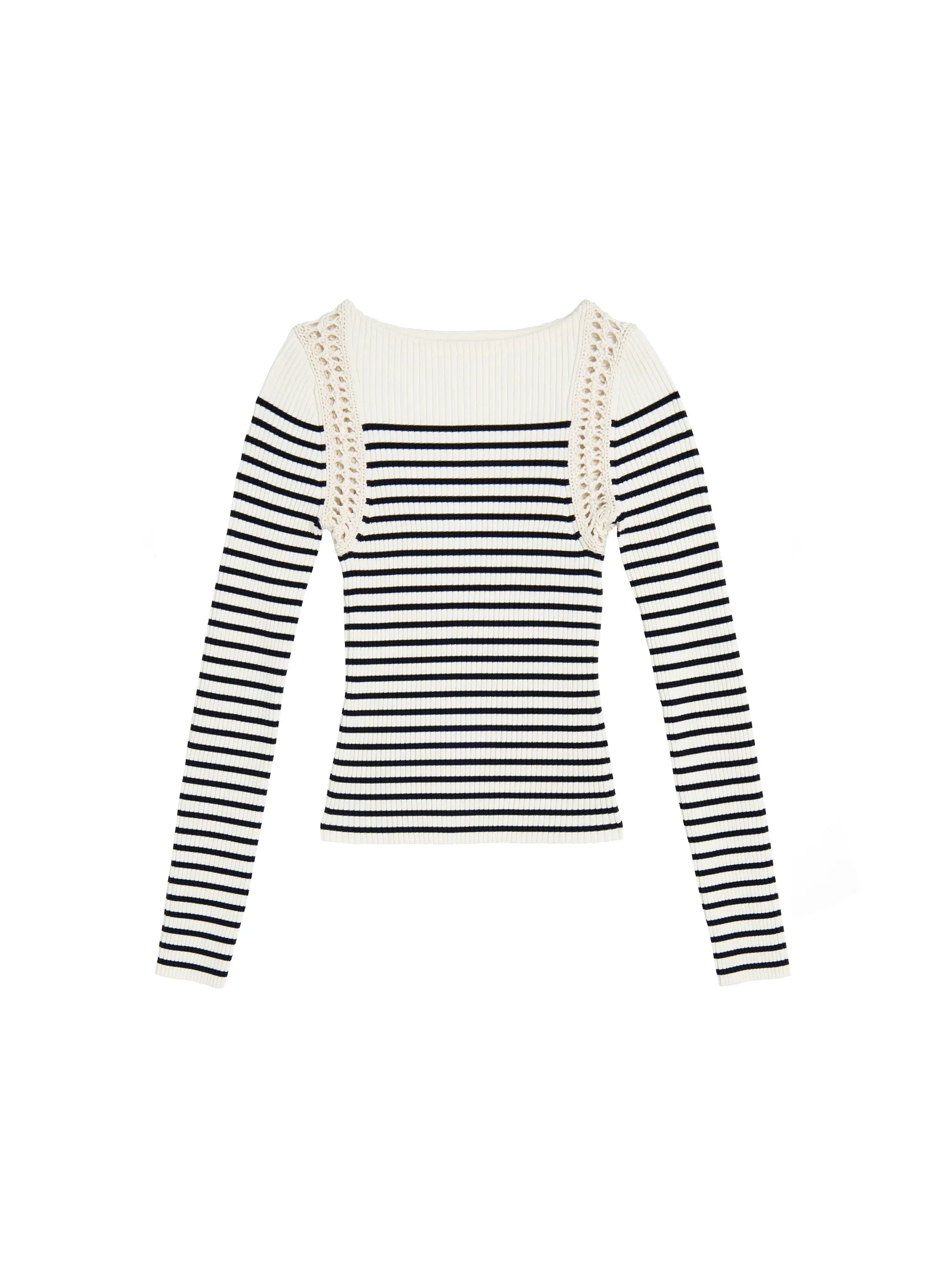 The Isa Top is knitted from a dry rayon viscose yarn in a navy and bone-white striped motif. This fitted silhouette is ribbed and features hand-crocheted detailing along the shoulders. a bateau neckline. and slim. long sleeves. Shop Tops