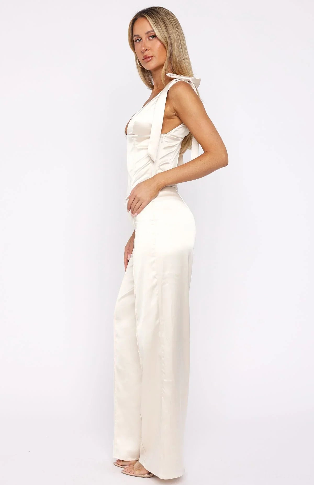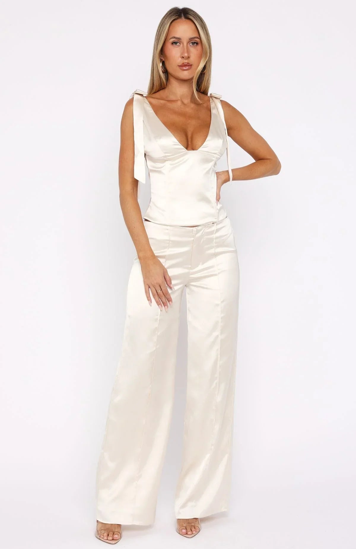 Holiday elegance in motion. The Keep It Lit Pants Pearl elevate your festive wardrobe with it's silky fabric, a fixed waistband for clean structure, and a refined hook‑and‑bar, zipper and button closure. Tailored front seams enhance the form, while the wide‑leg silhouette drapes beautifully and all fully lined. Style them with the matching Keep It Lit Top Pearl and statement heels for an effortlessly chic holiday look.