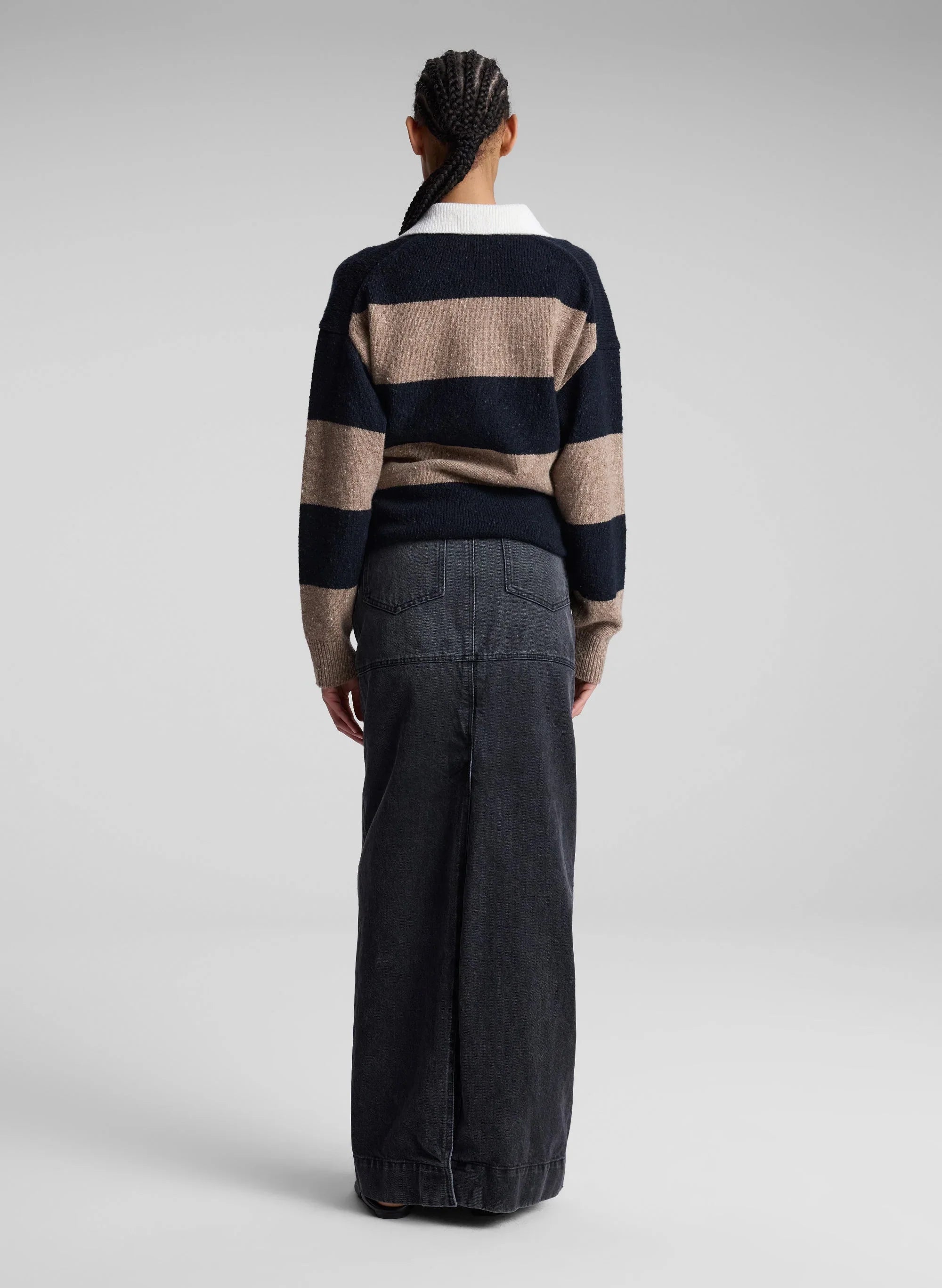 The Mason Sweater is knit from an Italian carded cashmere wool in a navy and milk tea stripe. This collared silhouette takes inspiration from classic rugby styles and features knuckle-grazing sleeves for a relaxed fit. This style runs true to size. Shop Sweaters.
