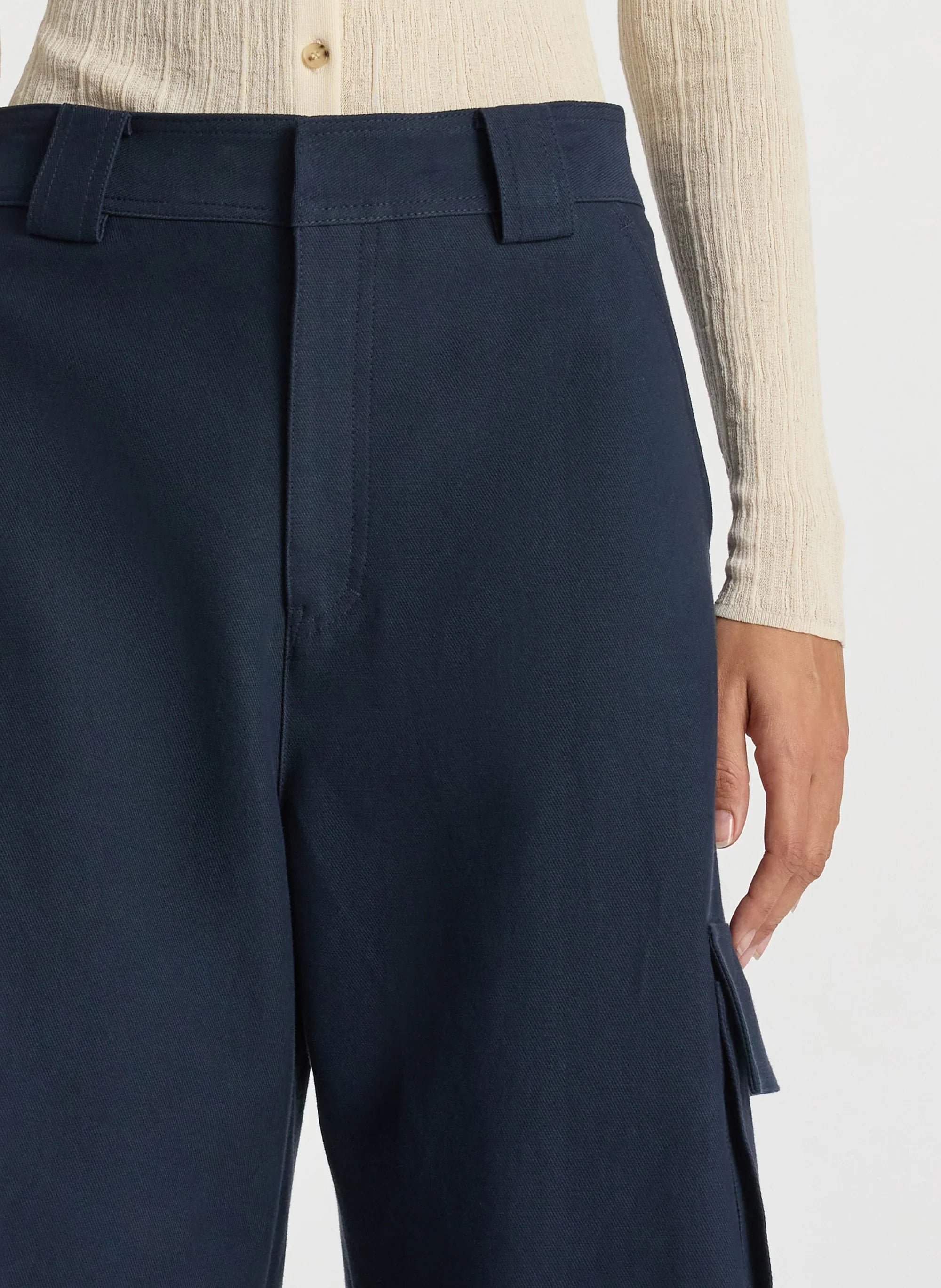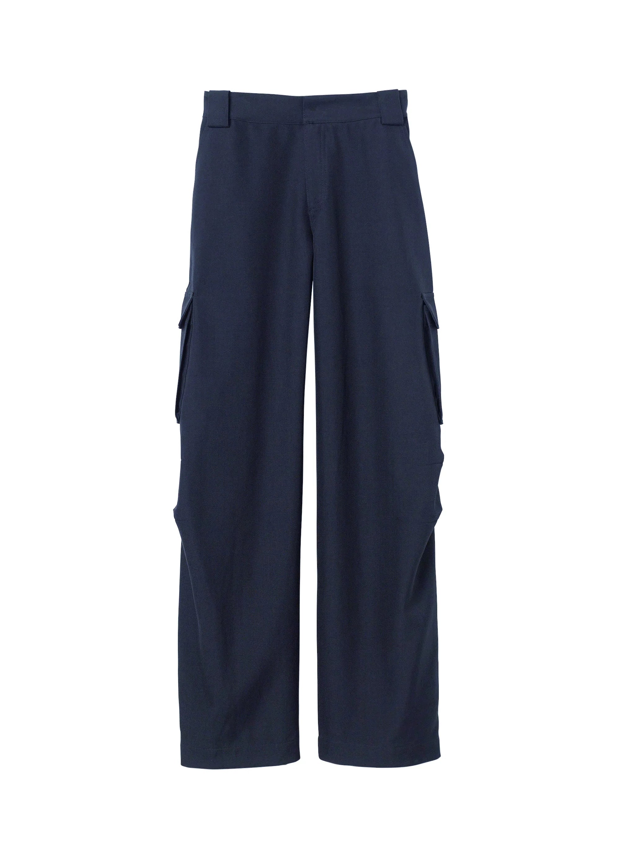 The Megan Pant is crafted from our structured blend of viscose cotton fabric in timeless navy. This mid-rise silhouette is a modern fusion of classic tailoring and utilitarian design. featuring roomy wide legs with large front cargo pockets and back patch pockets. Shop Bottoms