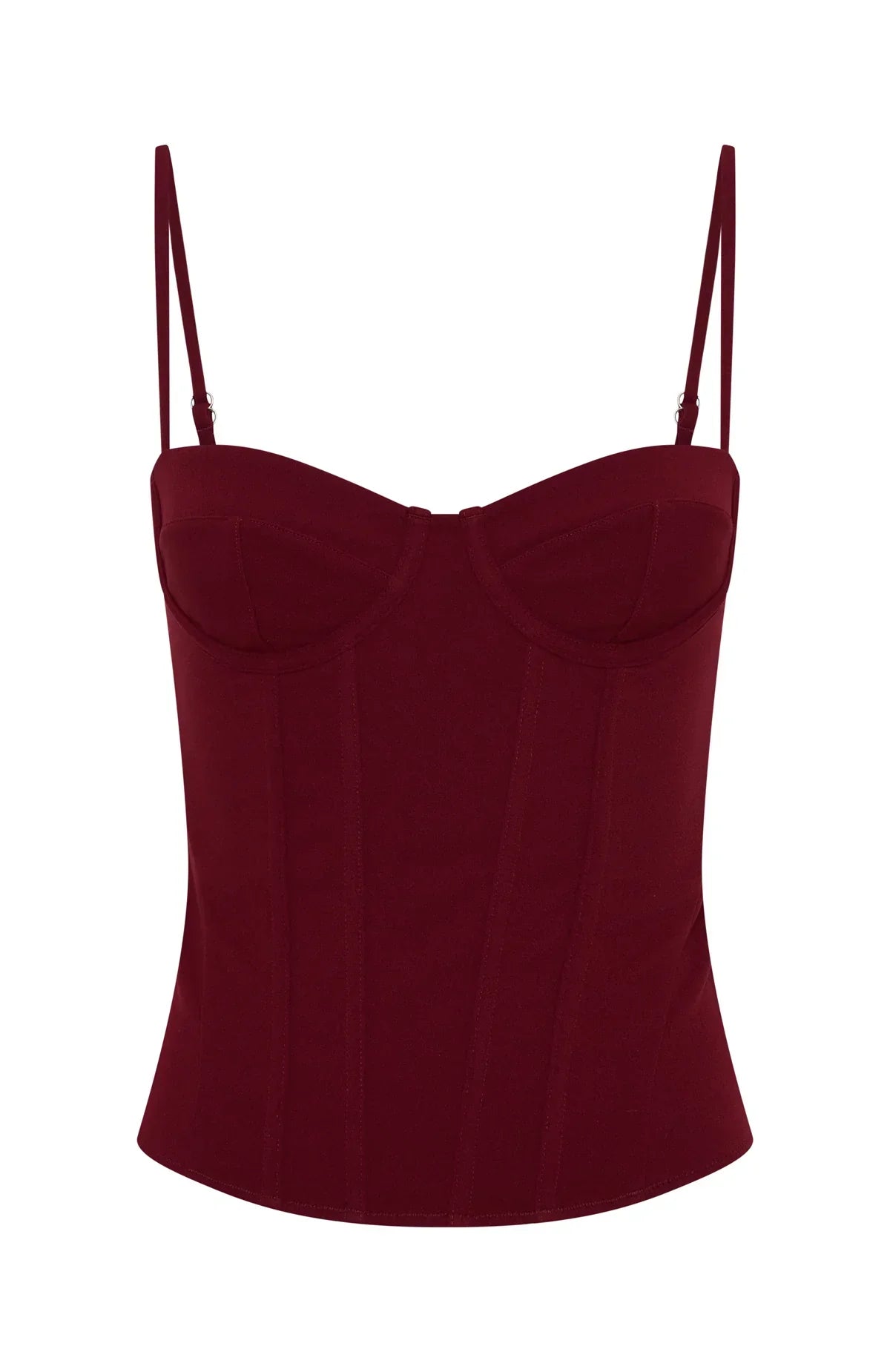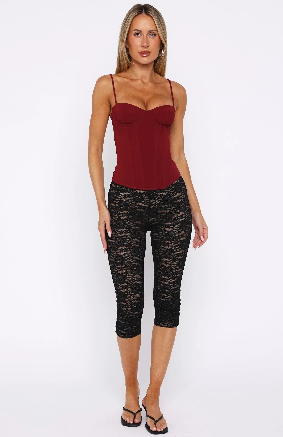 Tailored for you! The Moonlight Dance Bustier in Wine features a sweetheart neckline, adjustable spaghetti straps, and padded underwire cups for enhanced lift. The bodice is structured with internal boning and is fully lined for comfort. A concealed side zipper ensures a sleek silhouette, while the semi-stretch fabric allows for ease of movement. Style with the matching Vibe With Me Lace Capri Pants and kitten heels for a cute look.