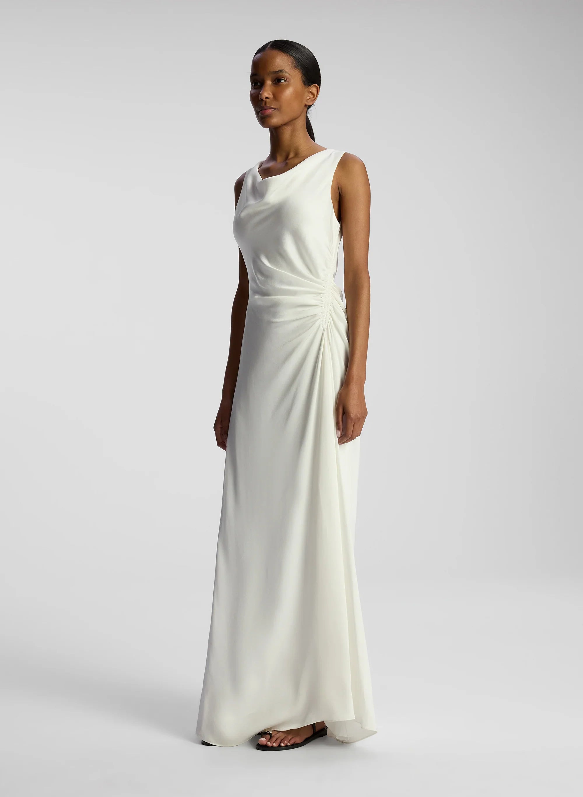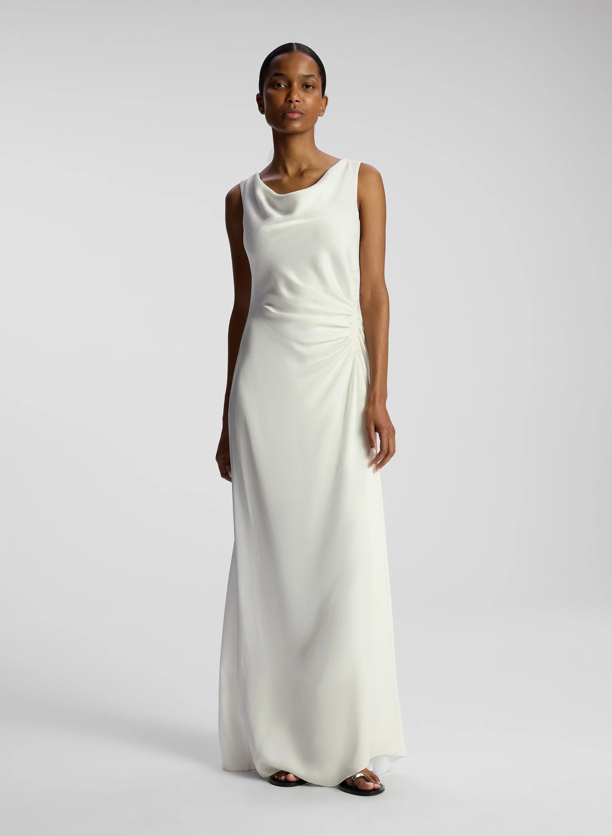 The Ophelia Dress is made from our fluid stretch satin fabric in an off-white hue. This full-length sleeveless silhouette features an elegantly draped cowl neckline and a gently scooped back. Gathering along the curved seam through the hip creates another focal point. flowing into a draped hemline. This style runs true to size. Shop Dresses.
