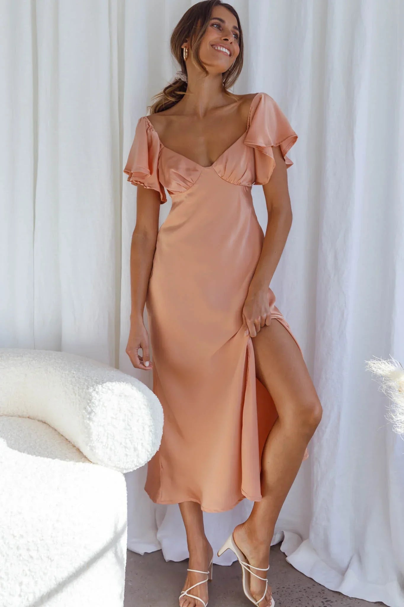 Dress to impress in our gorgeous Park Avenue midi dress. Featuring romantic flutter sleeves and a soft, satin fabric throughout. Perfect for a wedding or special event! Team it with kitten heels and a clutch for the ultimate It Girl look.