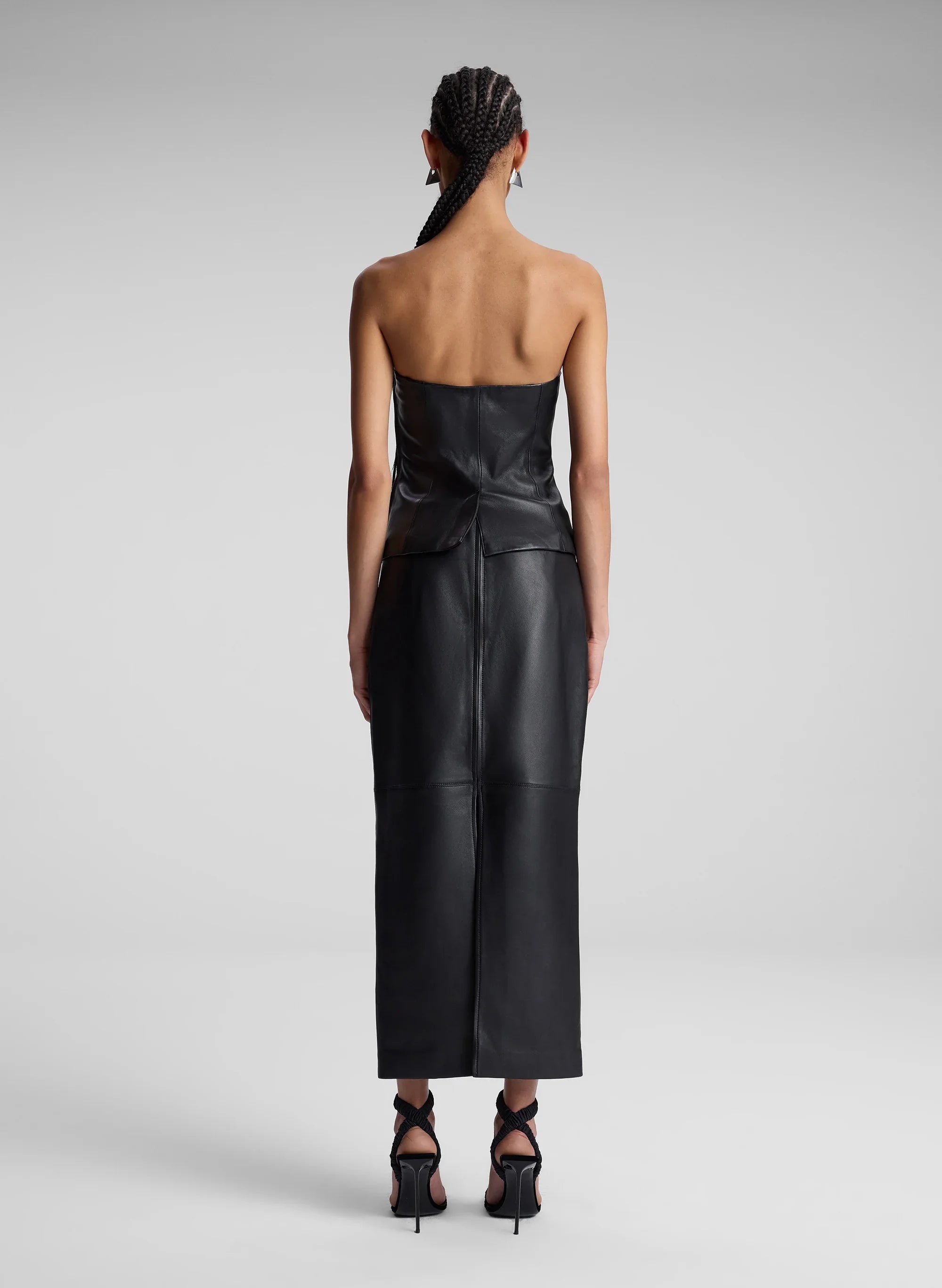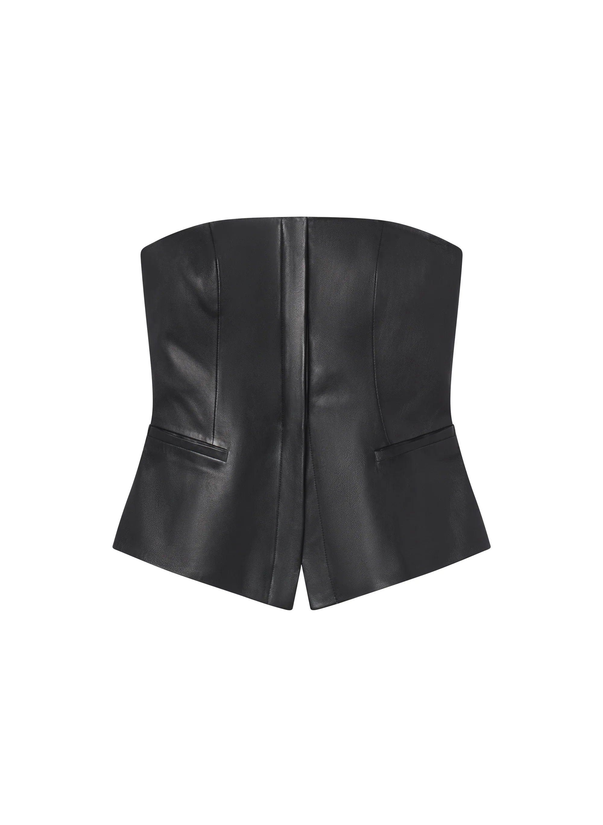 The Renee Top is crafted from 100% soft lamb leather in timeless black. This strapless top features a center seam that splits at the hem. offering an architectural take on corset dressing. This style runs true to size. Shop Tops.