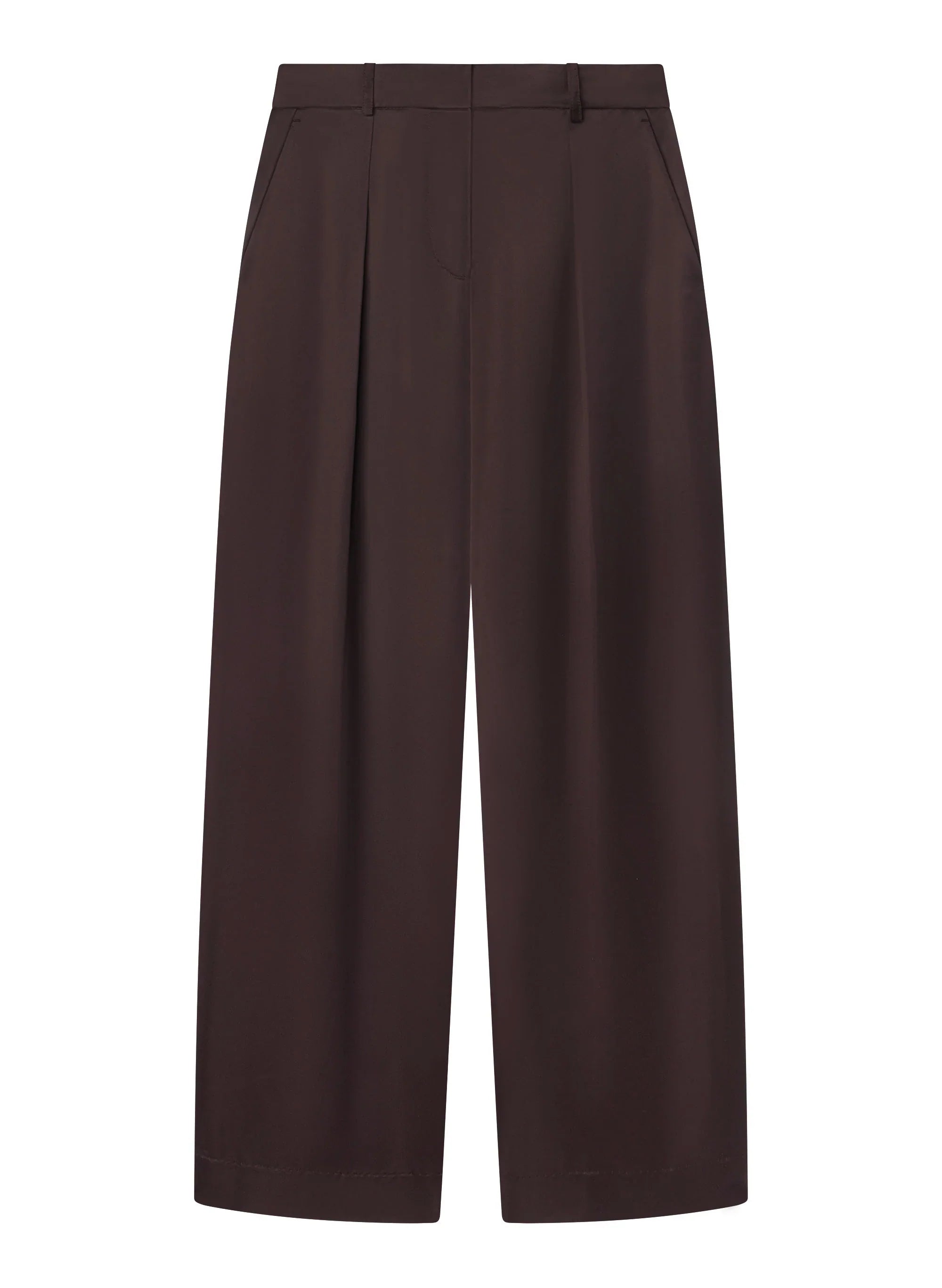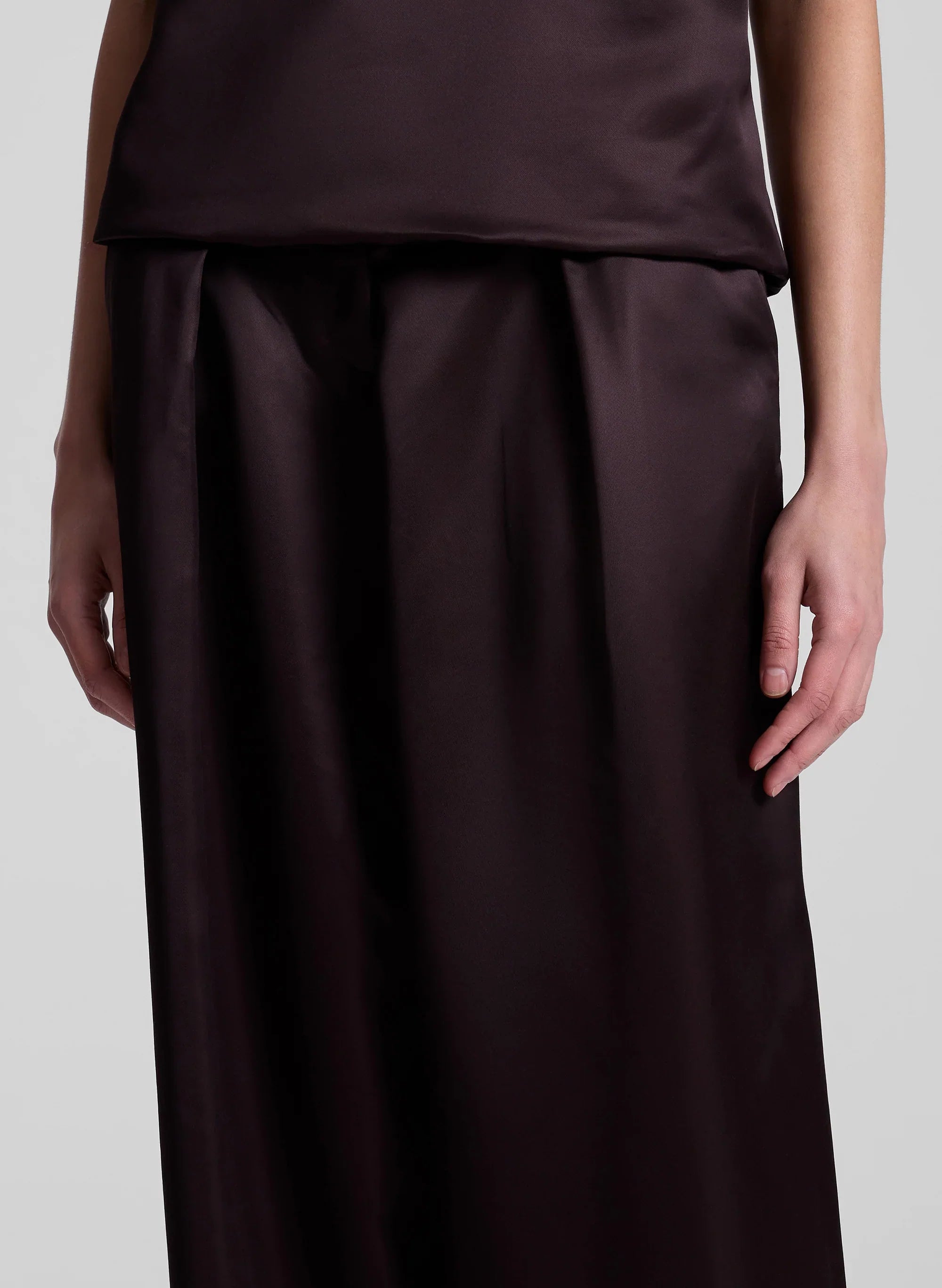 The Ryder Pant is crafted from our lustrous structured satin in a decadent chocolate plum hue. This high-waisted. full-length silhouette makes a bold volume statement. expertly balancing structure and softness. with front pleat detailing. side slash pockets. and back welt pockets. Designed to be worn with a heel. This style runs true to size. Shop Bottoms.