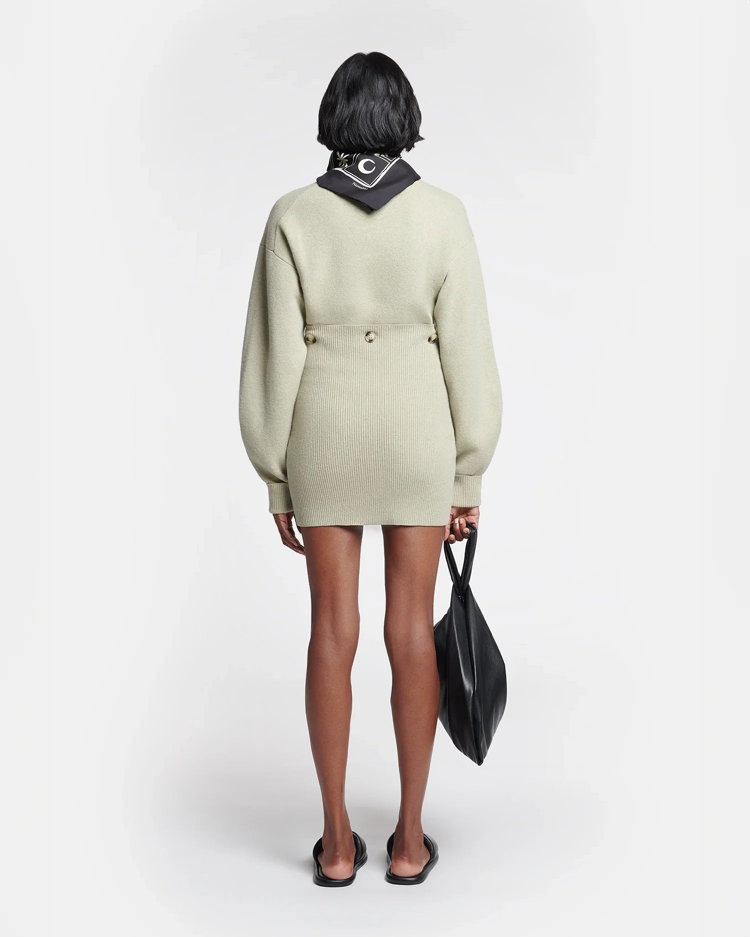 The Strahe dress demonstrates our interest in modularity. ensuring endless styling versatility. Made from soft compact merino wool. it can be unbuttoned at the waist to create a sporty cropped sweater. The stone hue just adds to its wearability.