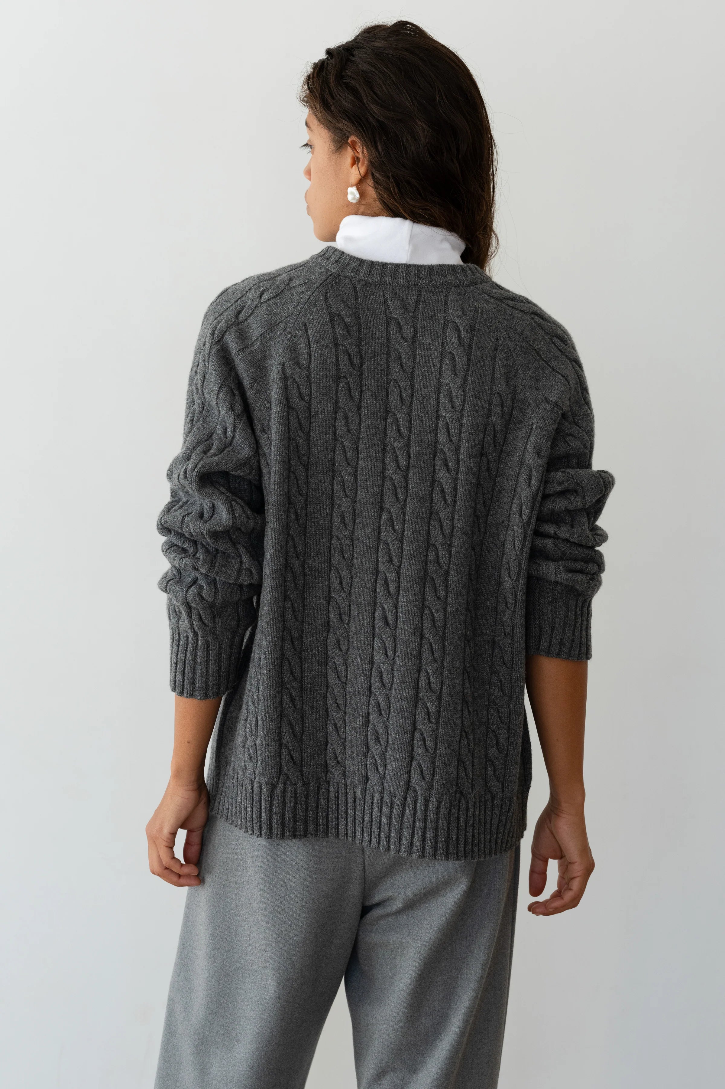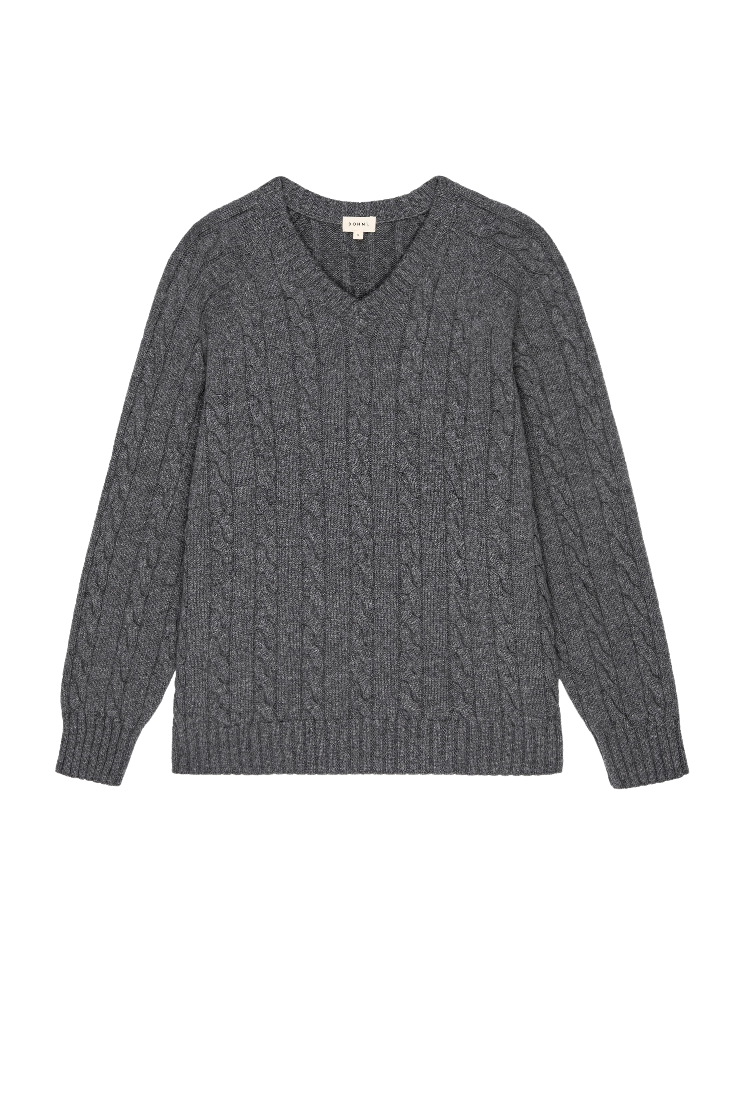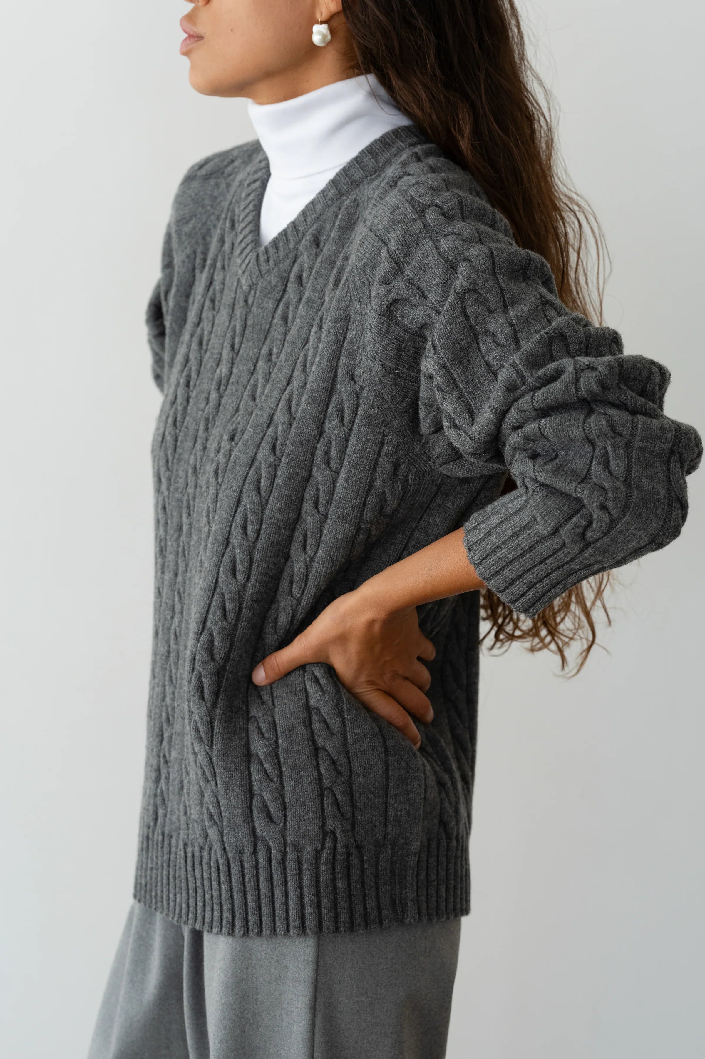 The Cable V-Neck Sweater is crafted from 85% Wool and 15% Italian cashmere. the perfect balance of softness and warmth. Designed with a relaxed silhouette. v-neck. and cable knit design.