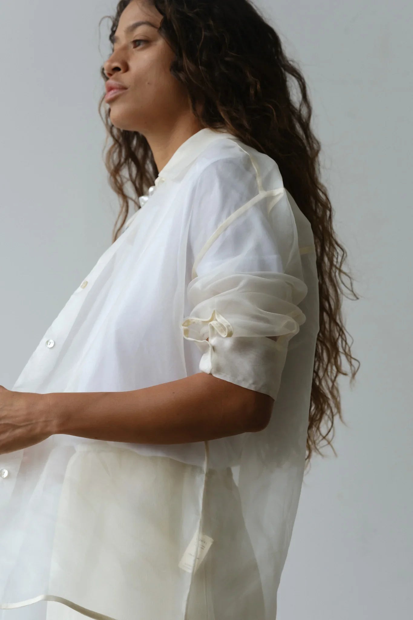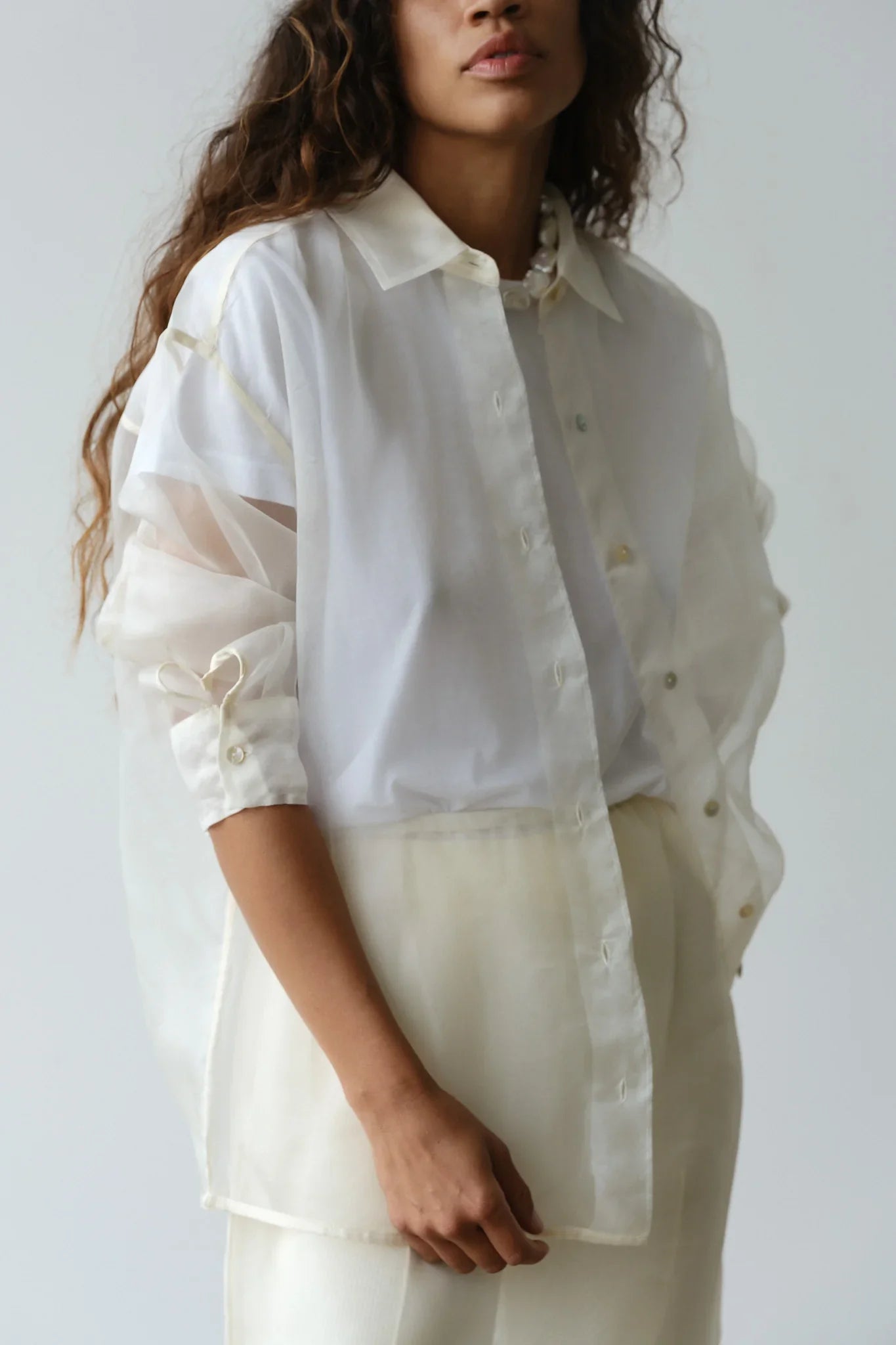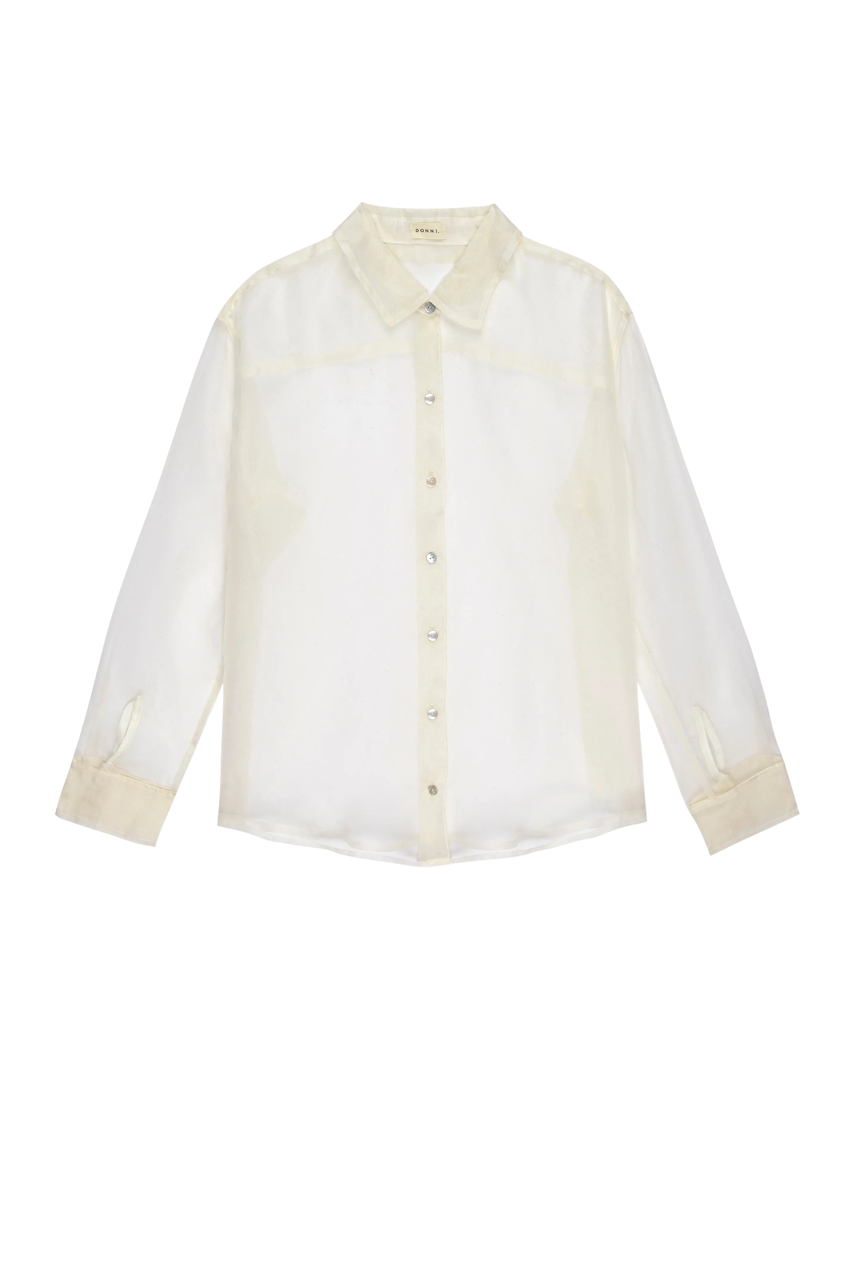 The Organza Shirt is crafted from 100% silk. We love this top worn on it's own or as a light jacket. It features. mother of pearl buttons. dropped shoulders. and a relaxed fit.