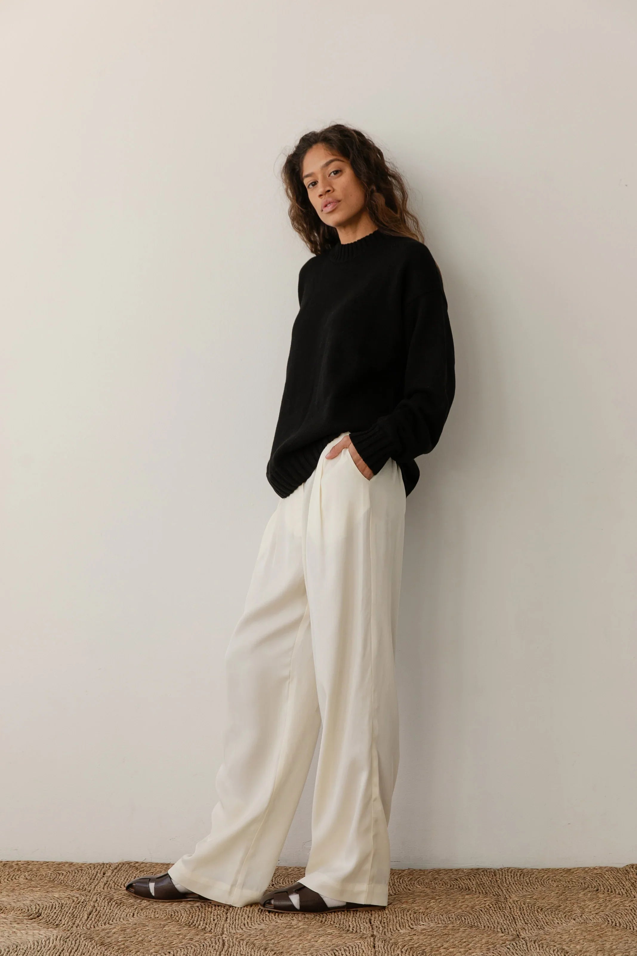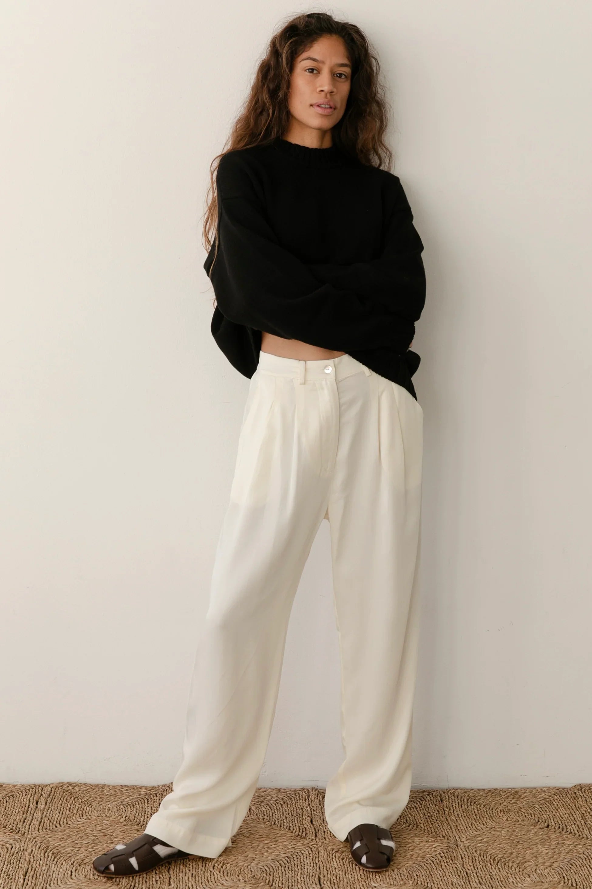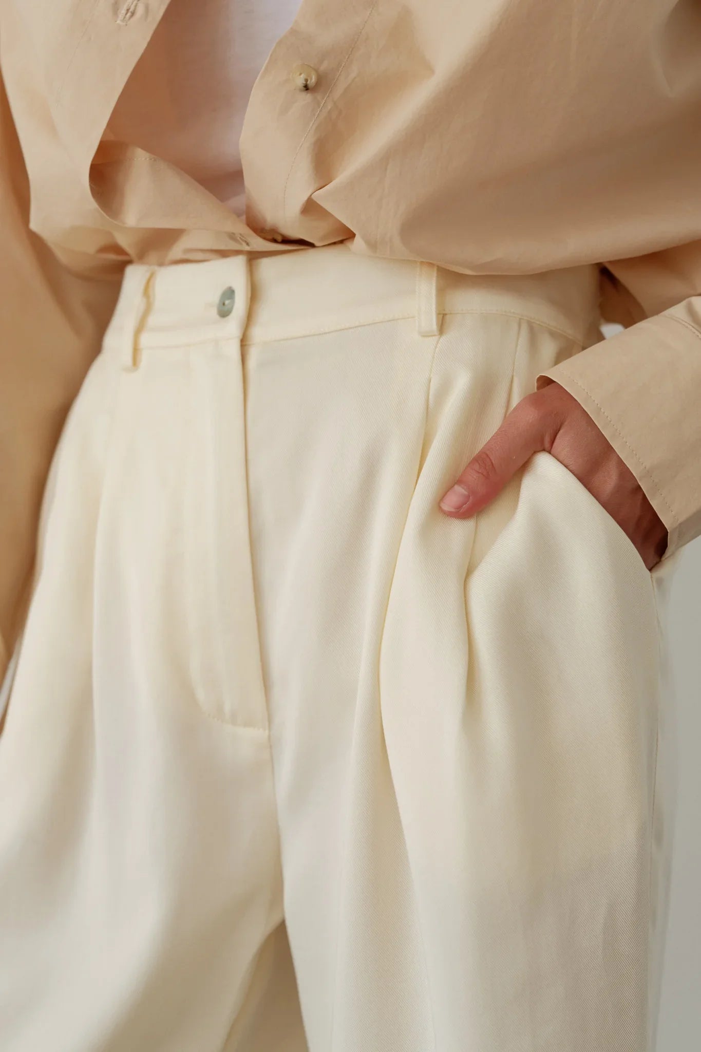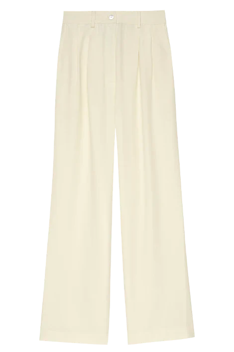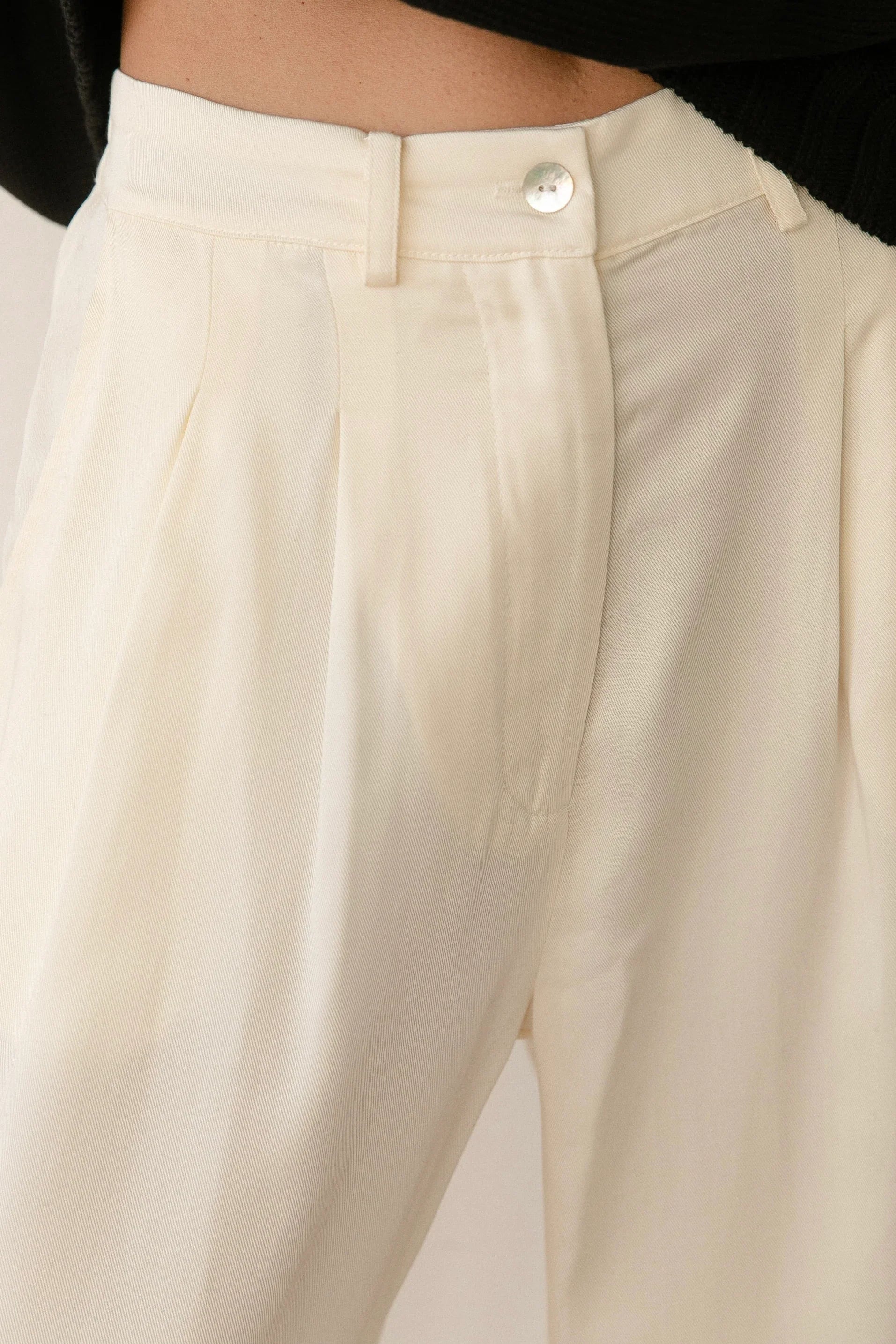 The Pleated Trouser is crafted with 100% Lyocell Twill. featuring a relaxed fit. mother of pearl buttons. belt loops. pockets and pleats.