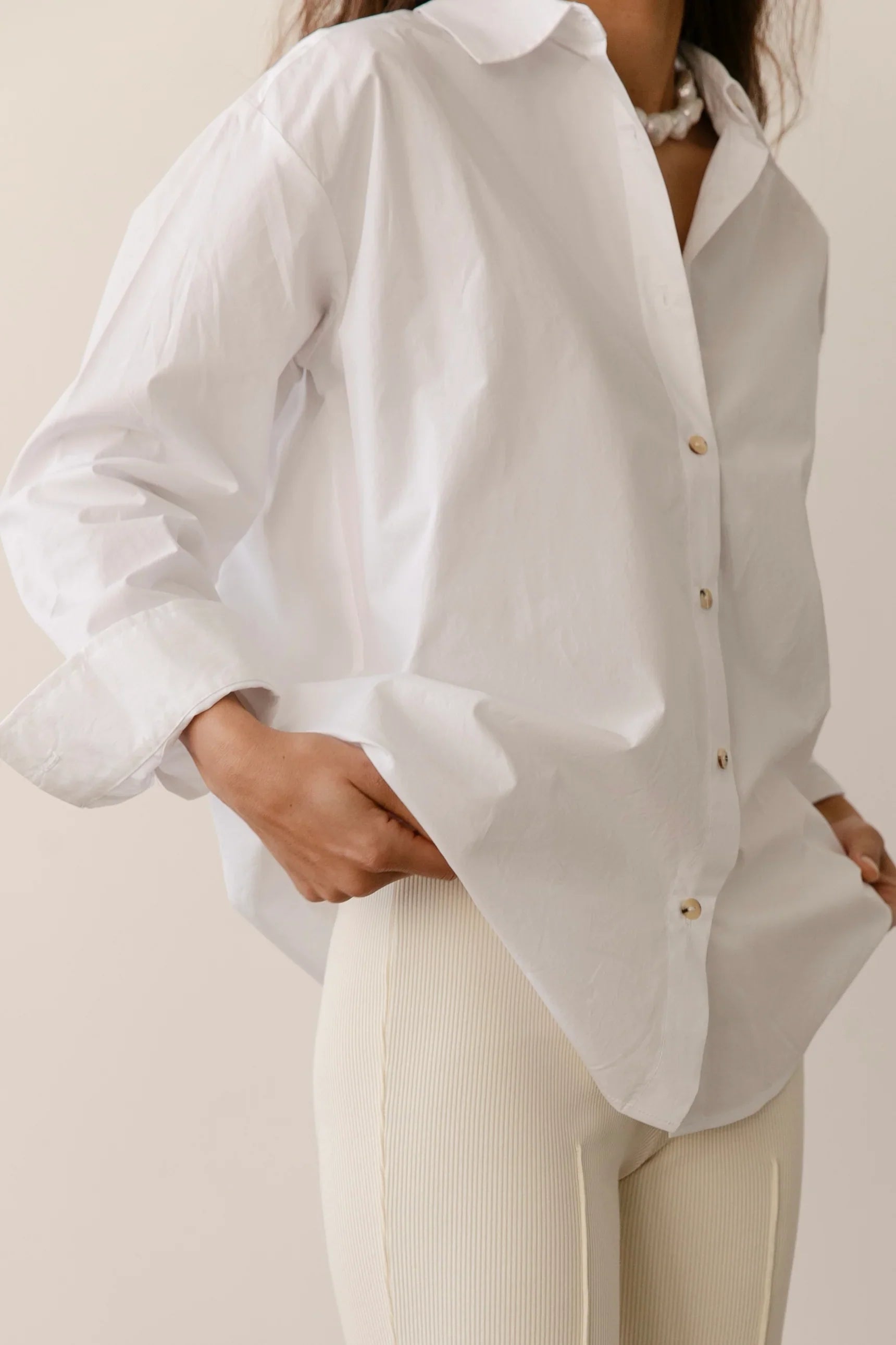 A season-less essential crafted with 100% cotton poplin. featuring a subtle dropped shoulder and tortoise-like buttons.