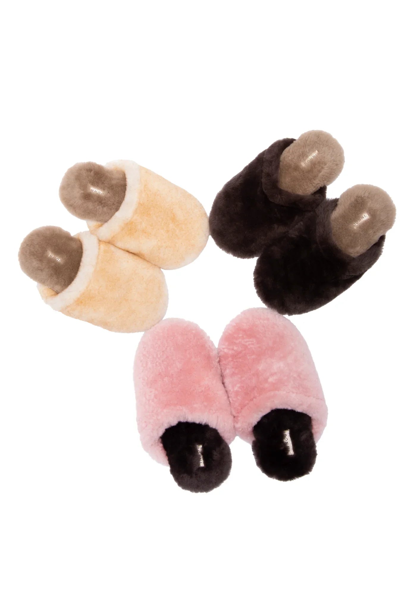 The Shearling Slipper Slides are crafted with genuine sheepskin and come with an upcycled DONNI. fabric slipper pouch. This item is made to order. please allow 10-14 business days to customize your pair.