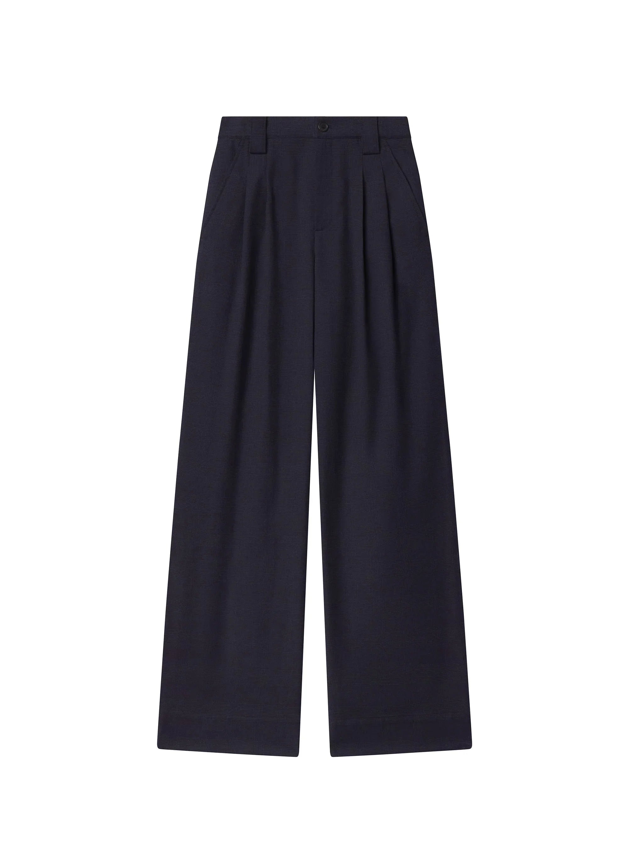 The Tommy II Pant is crafted from our wool cotton blend fabric in a navy blue hue. Offering slightly less volume at the thigh than our best-selling Tommy Pant. this wide-leg silhouette features front pleats. side slash pockets and back welt pockets with a mid-rise fit meant to sit right at the hips. This style runs true to size. Shop Bottoms.