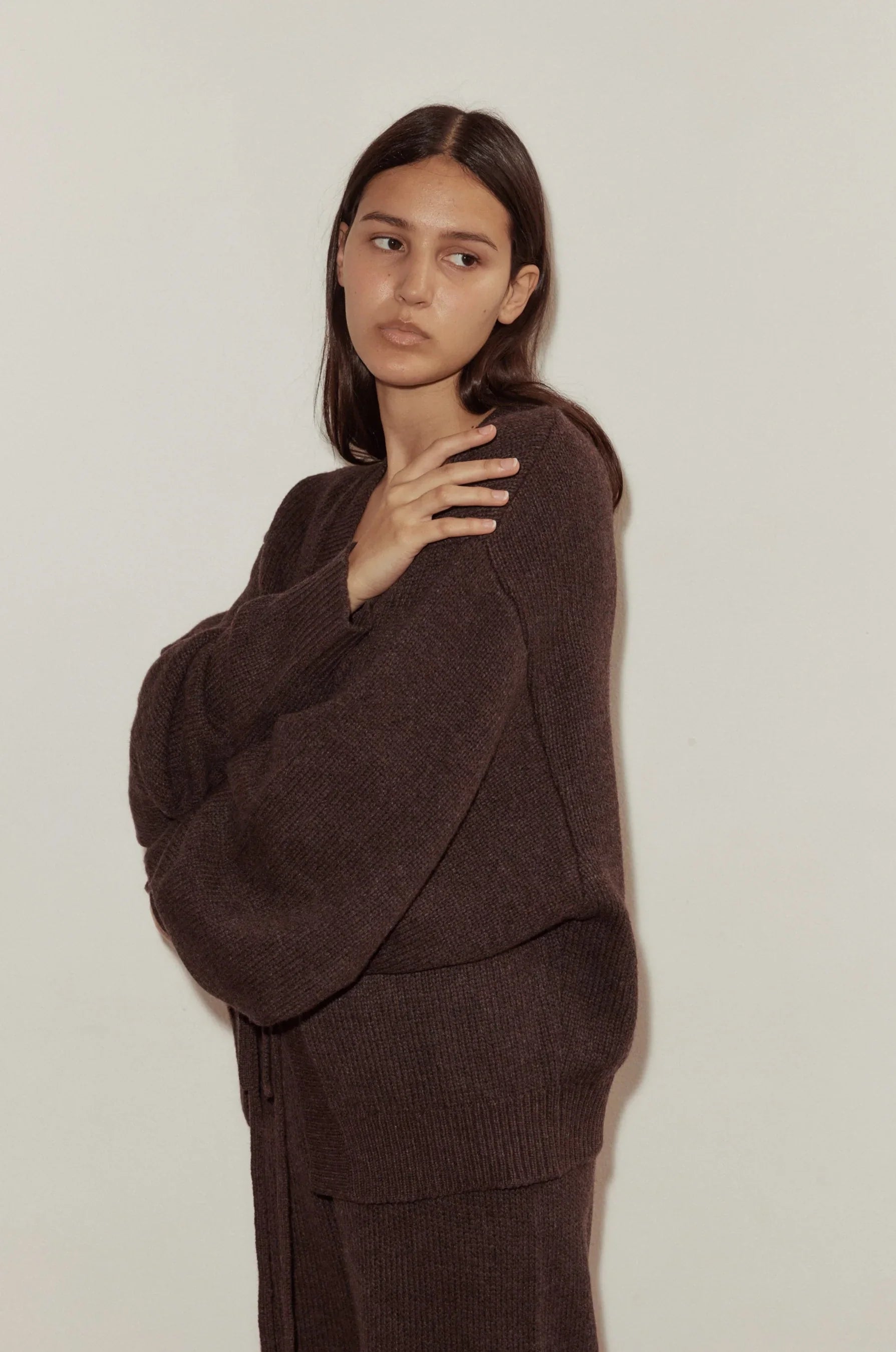 a mottled textured cardigan in a sustainable wool blend featuring a v neck front with two self fabric ties. dropped shoulder and a wide tapered arm for a relaxed look. ribbed hem and oversized fit for layering
