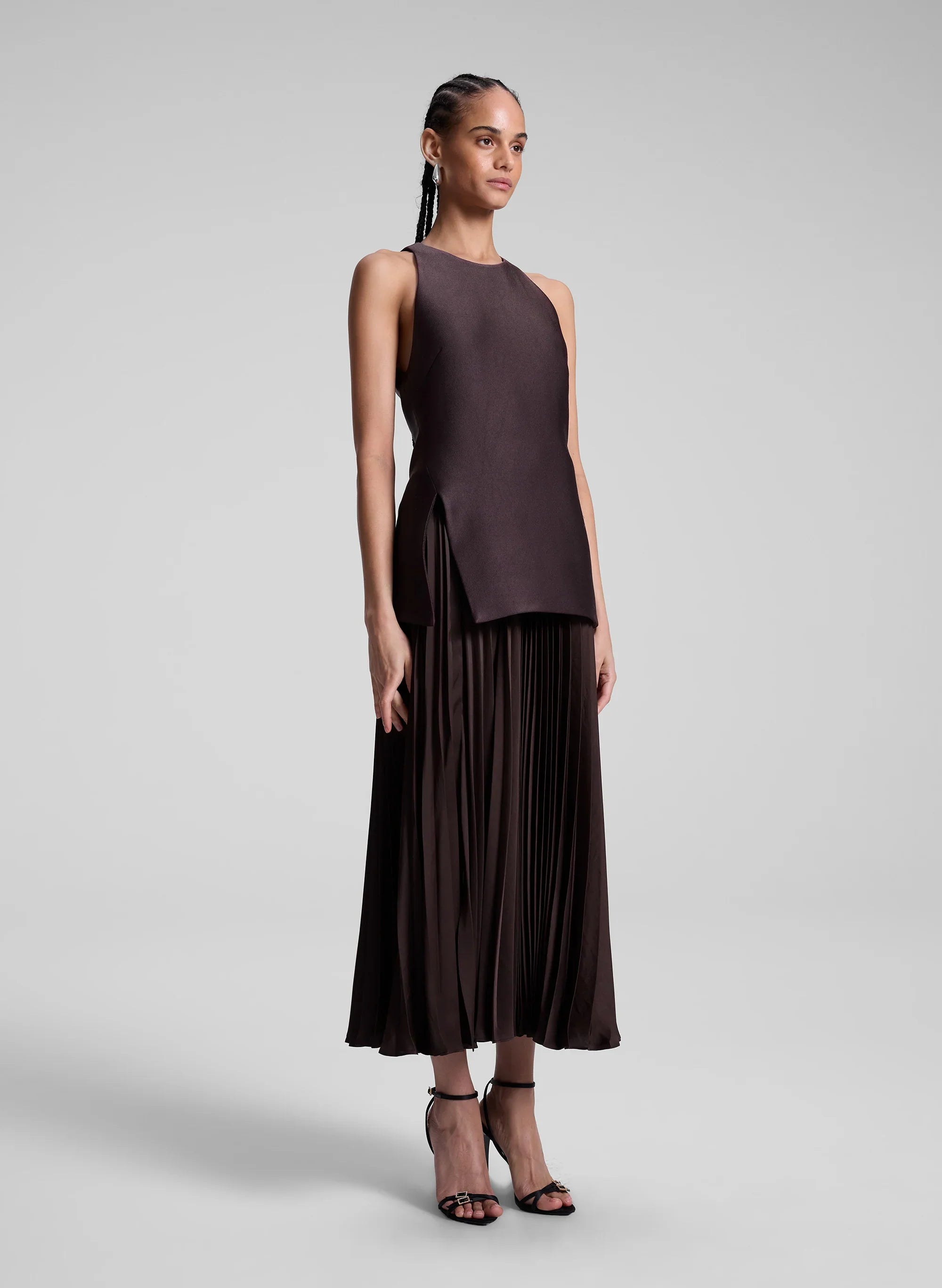 The Willow Dress is crafted from luxe hammered crepe in a rich chocolate plum hue. Designed to look like separates. this midi-length style features a sleek. minimalist sleeveless top paired with a flowing pleated skirt—an A.L.C. signature—creating a refined and dimensional effect. Shop Dresses.