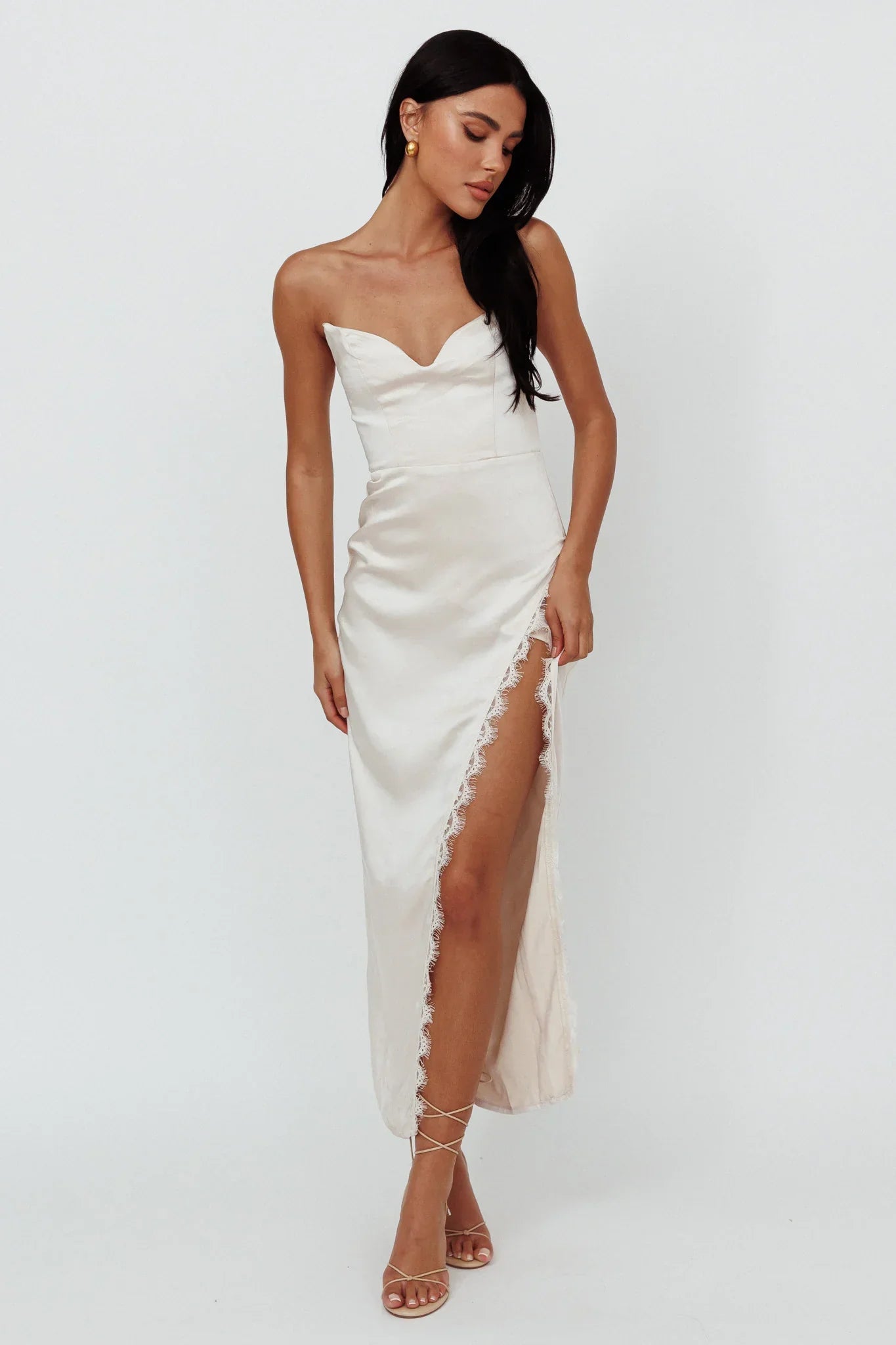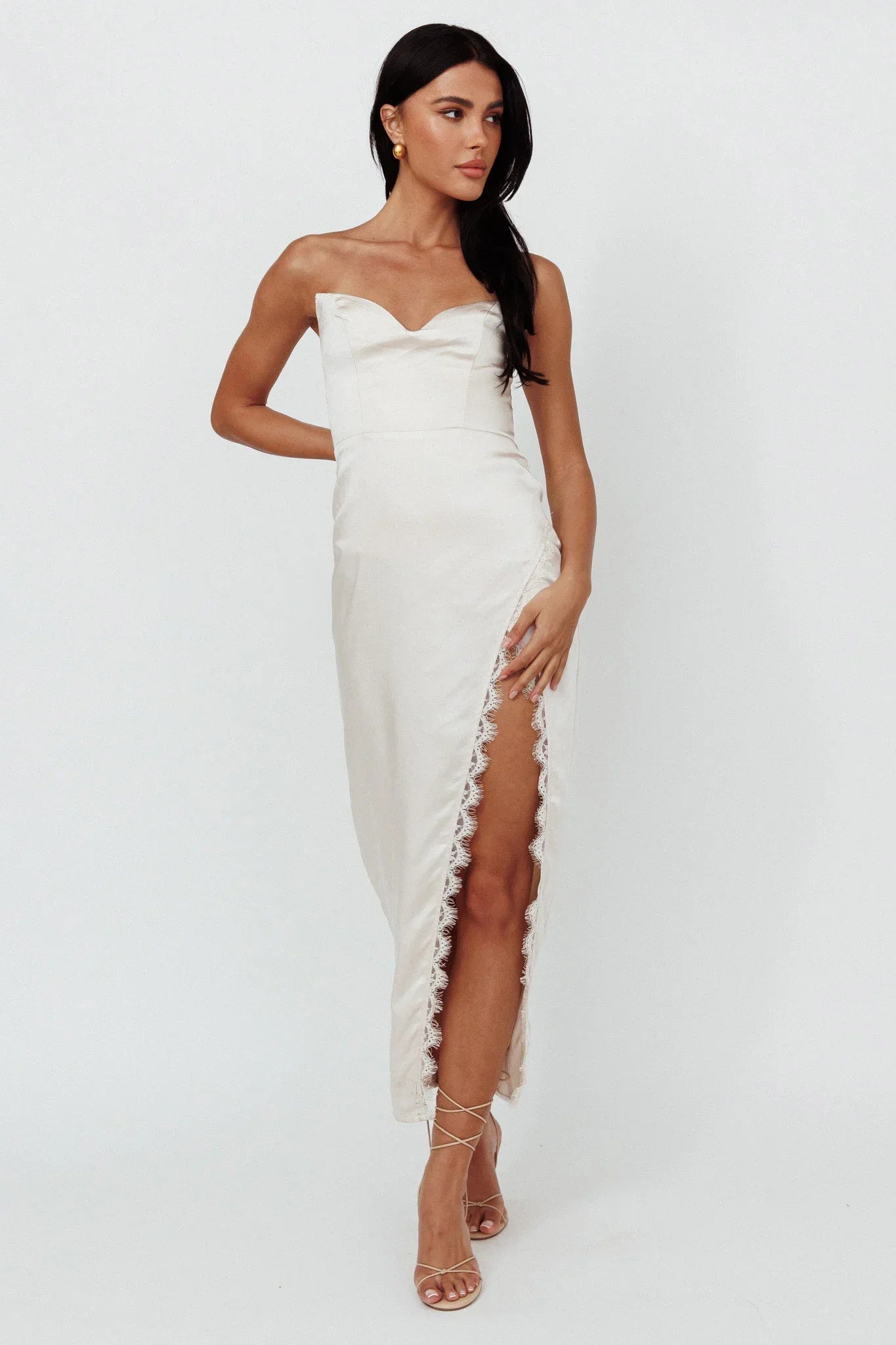 Steal the spotlight in our stunning Winter Moon midi dress. Featuring a split in the front with eyelash lace trim. It's perfect for prom or a special gala event. Team it with nude, strappy heels and a purse for an unforgettable look.